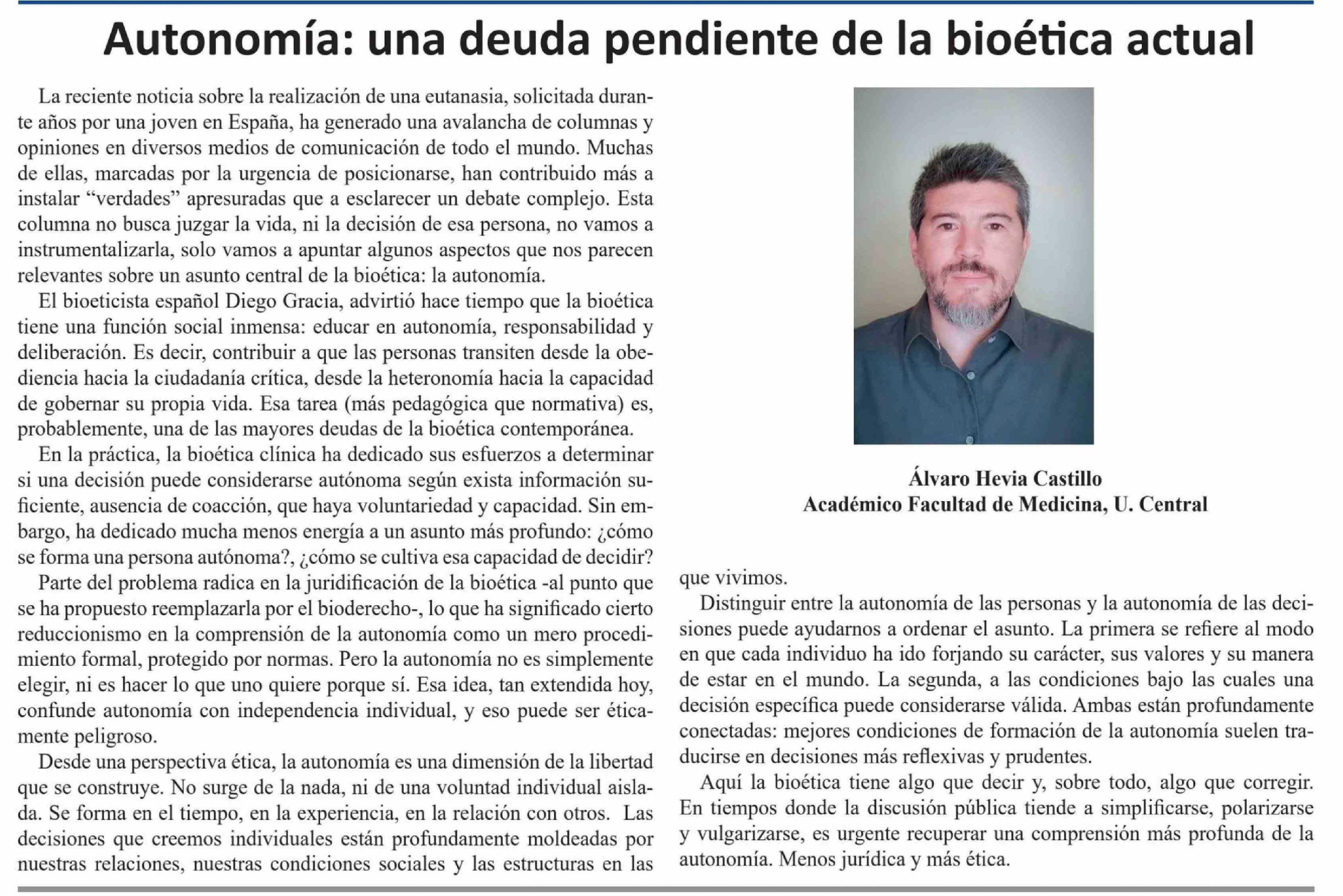 Título: Columnas de Opinión: Autonomía: una deuda pendiente de la bioética actual