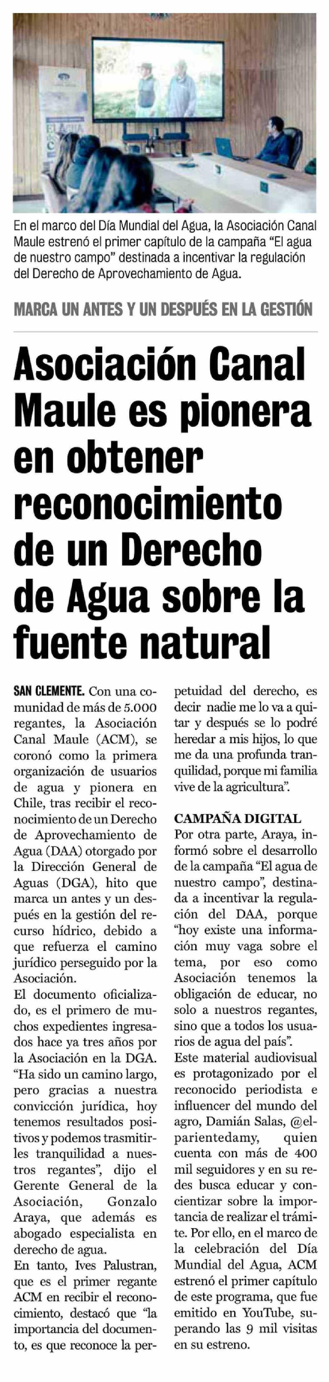 Asociación Canal Maule es pionera en obtener reconocimiento de un Derecho de Agua sobre la fuente natural 26-03-2026 La Prensa de Curicó |