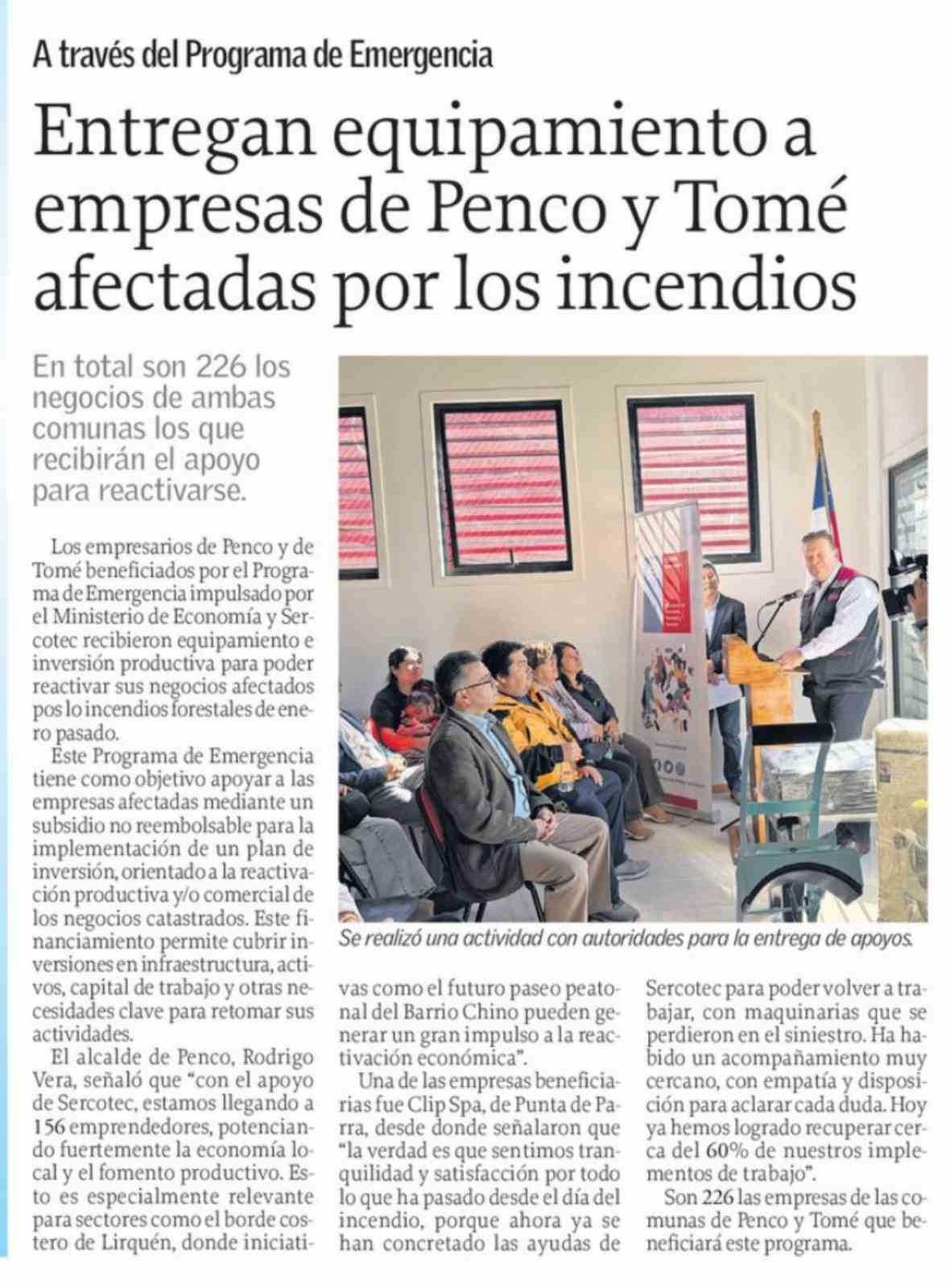 Entregan equipamiento a empresas de Penco y Tomé afectadas por los incendios 06-04-2026 El Sur |