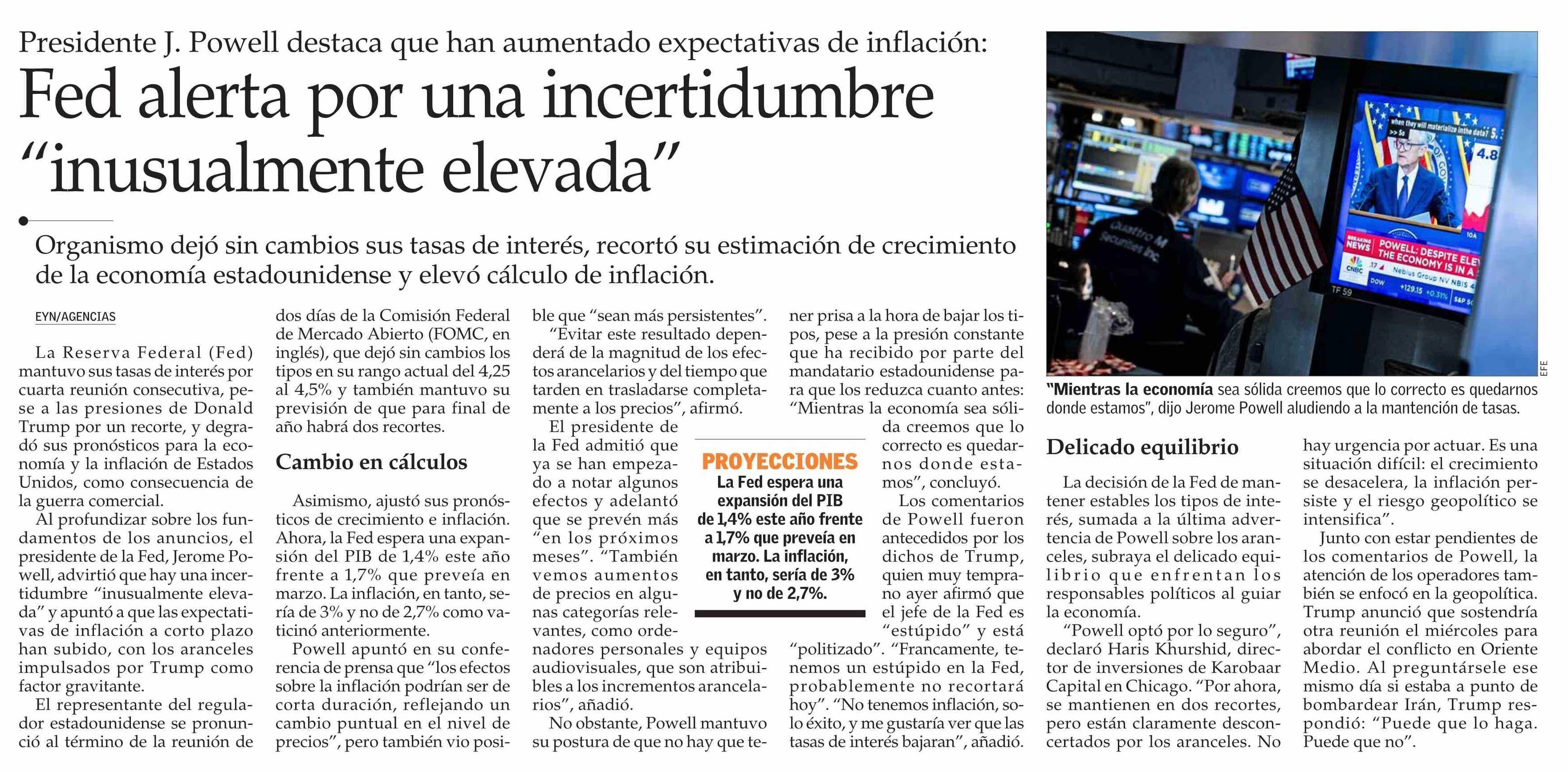 Fed alerta por una incertidumbre “inusualmente elevada” 19-06-2025 El Mercurio |