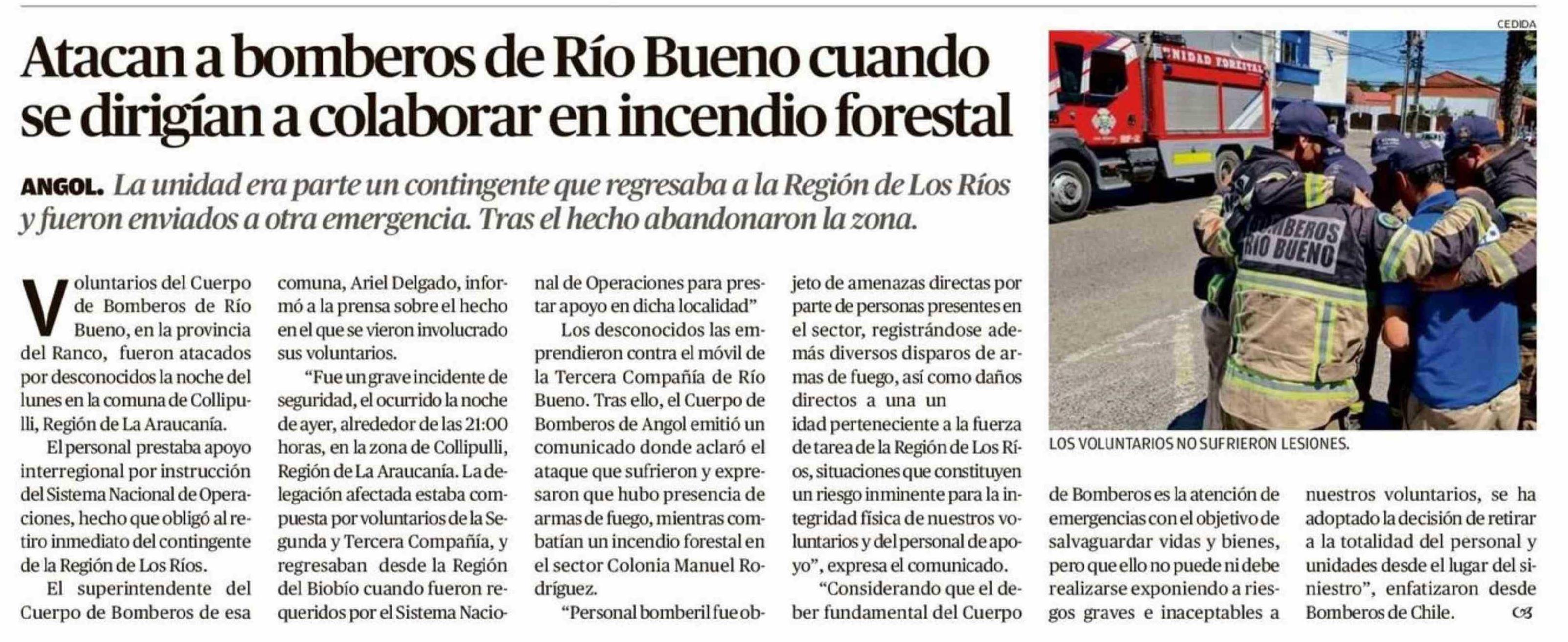 Atacan a bomberos de Río Bueno cuando se dirigían a colaborar en incendio forestal 21-01-2026 El Austral de Osorno |