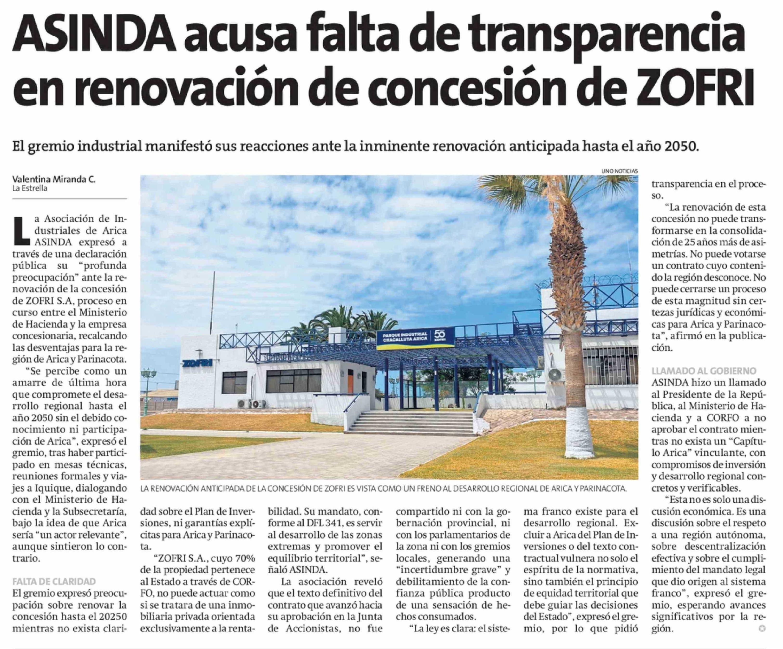 ASINDA acusa falta de transparencia en renovación de concesión de ZOFRI 21-02-2026 La Estrella de Arica |