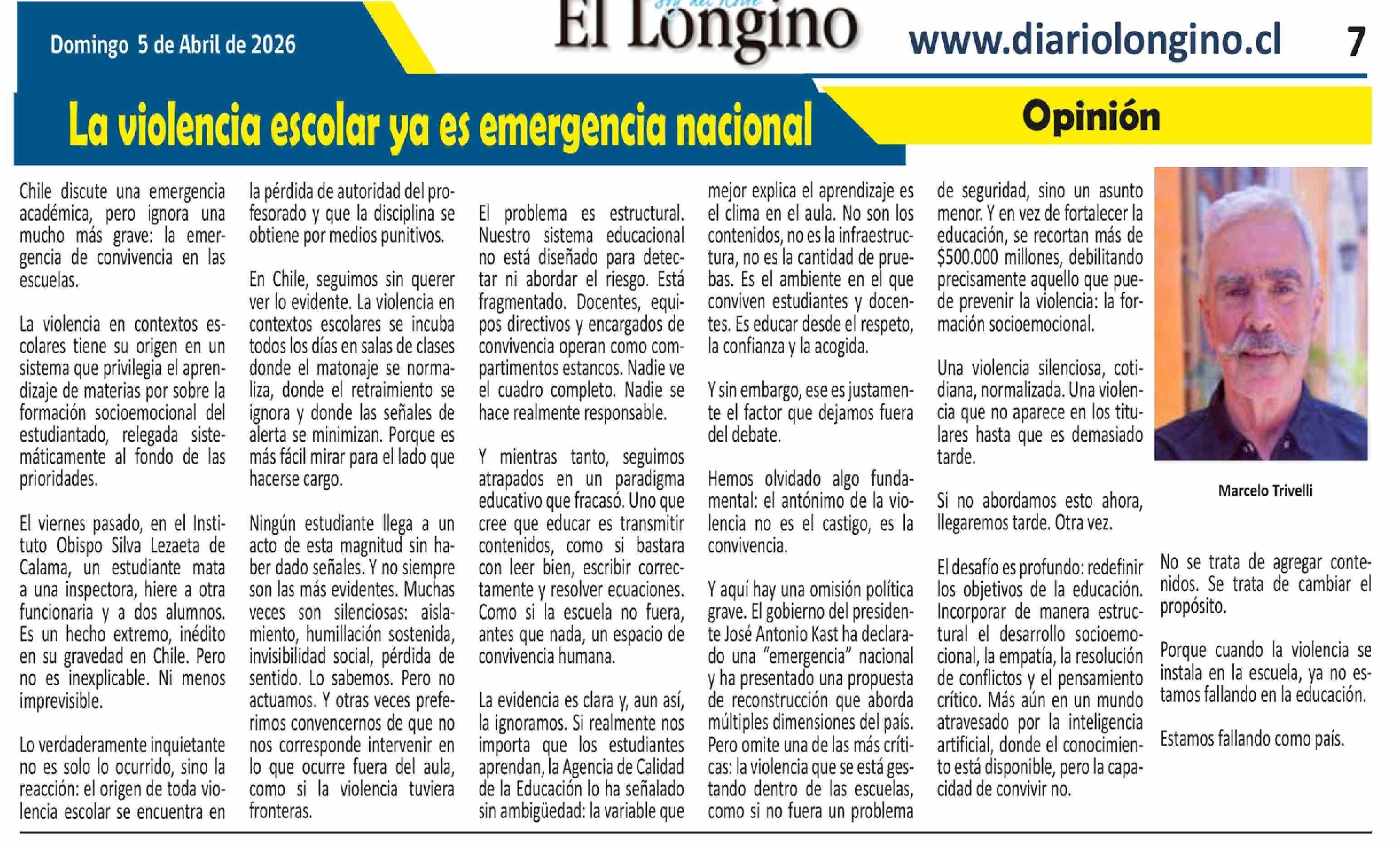 Título: Columnas de Opinión: La violencia escolar ya es emergencia nacional