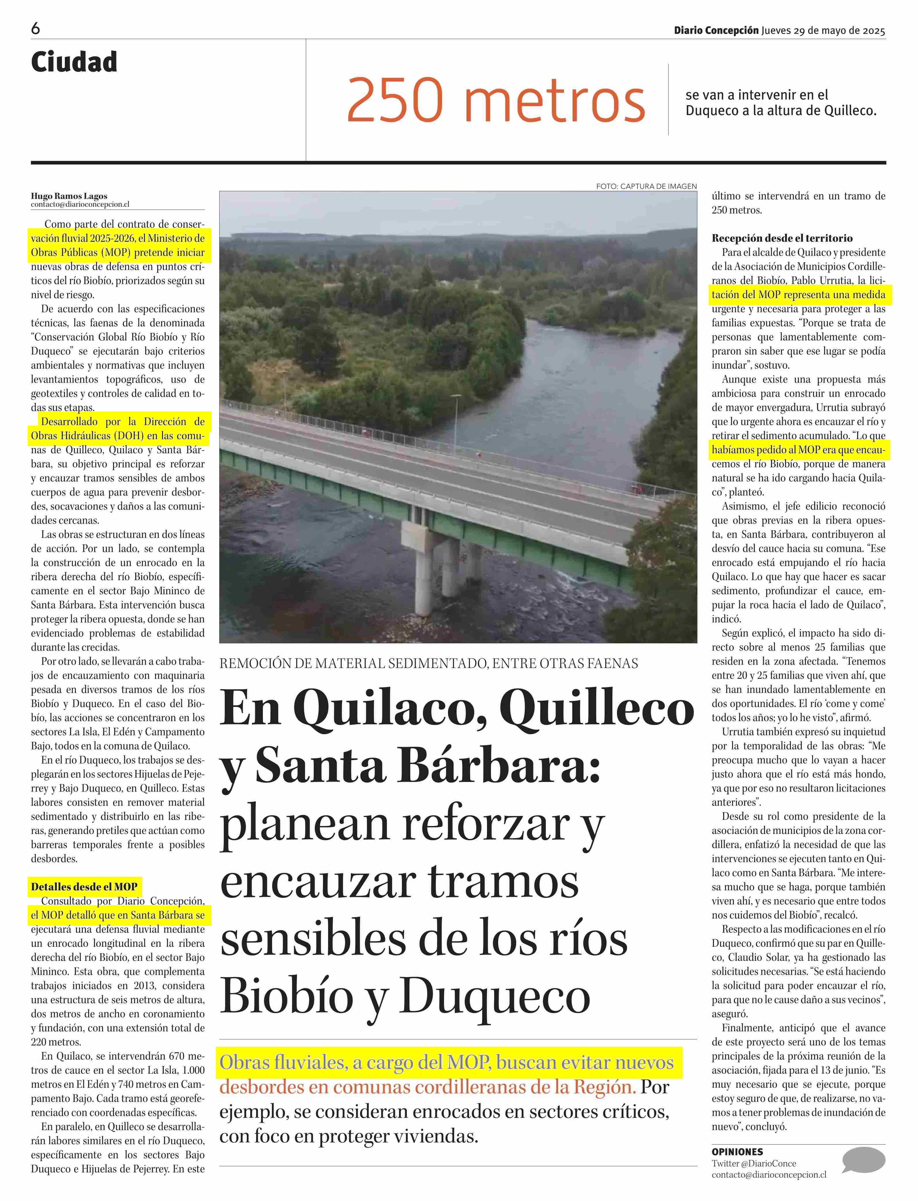 En Quilaco, Quilleco y Santa Bárbara: planean reforzar y encauzar tramos sensibles de los ríos Biobío y Duqueco 29-05-2025 Diario Concepción |