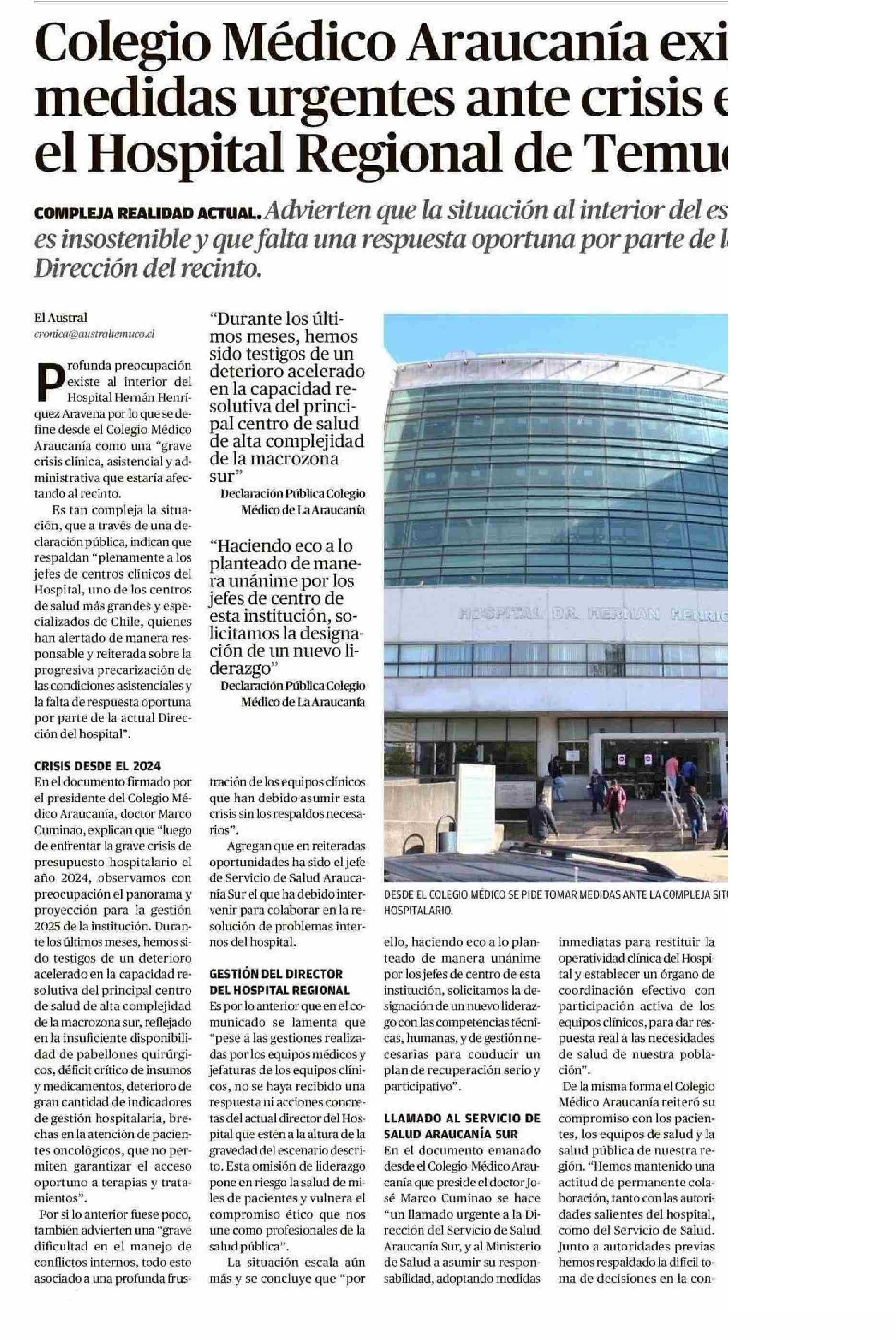 Colegio Médico Araucanía exige medidas urgentes ante crisis en el Hospital Regional de Temuco 02-06-2025 El Austral de la Araucanía |