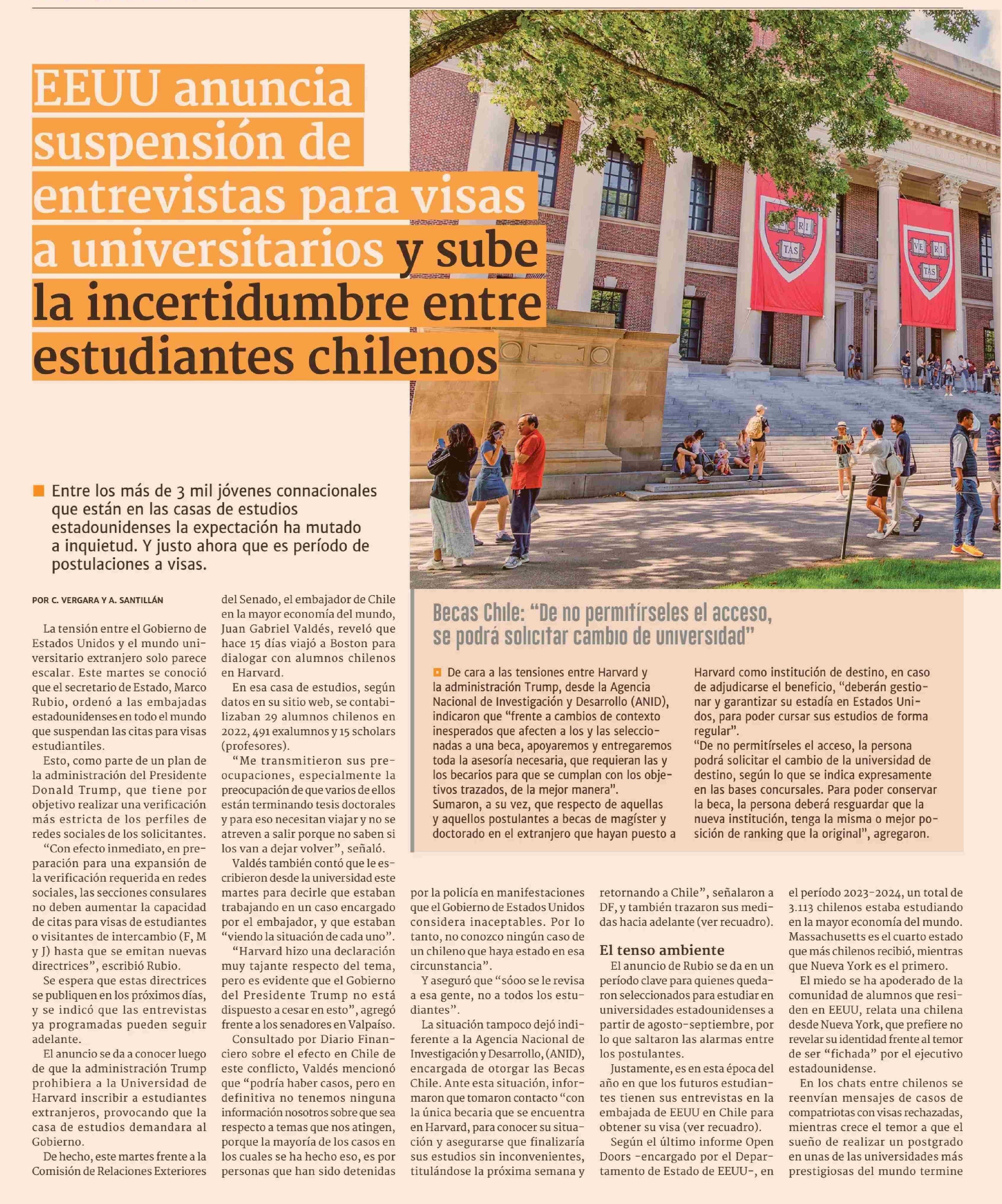 EEUU anuncia suspensión de entrevistas para visas a universitarios y sube la incertidumbre entre estudiantes chilenos 28-05-2025 Diario Financiero |