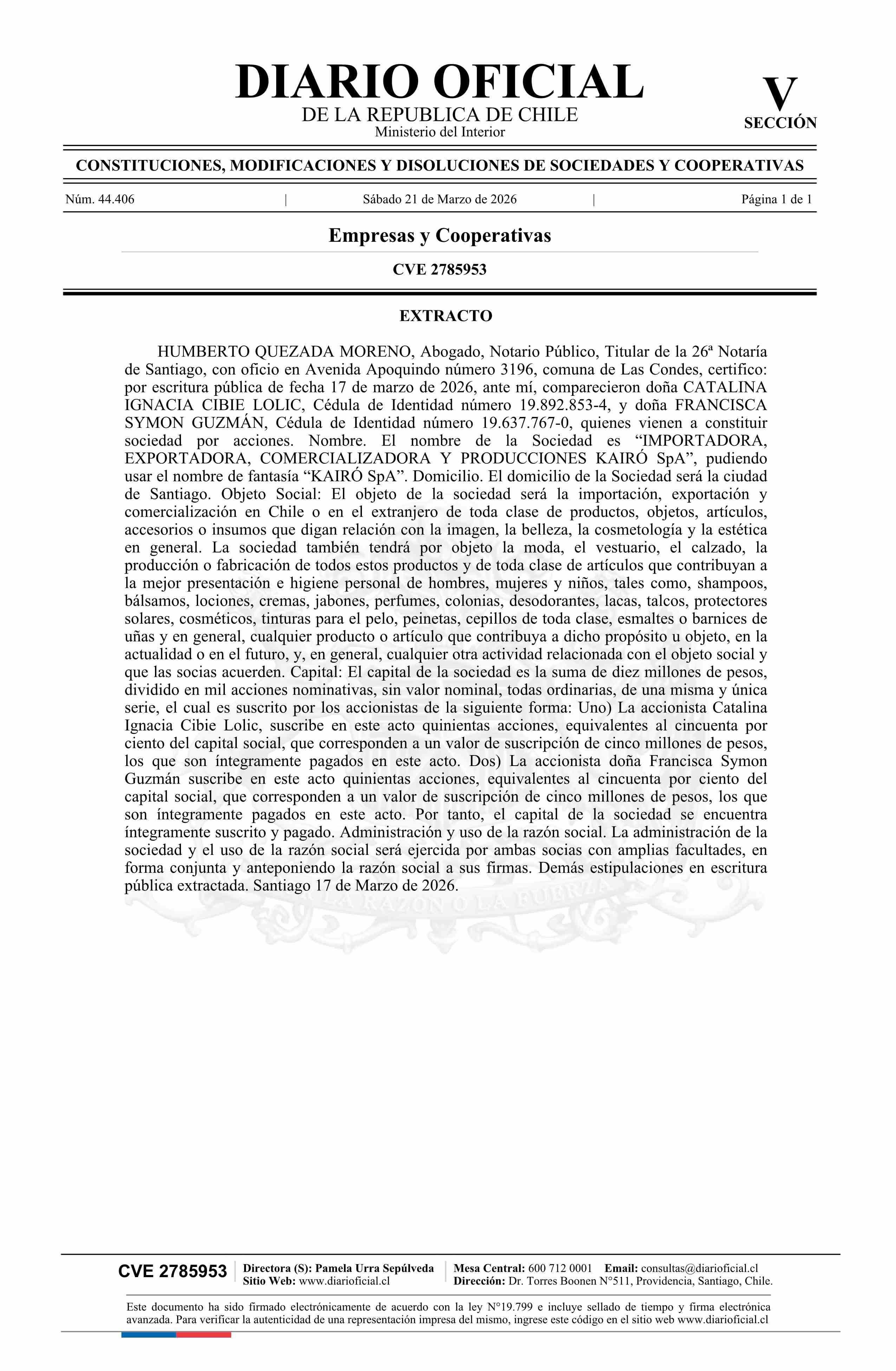Importadora, Exportadora, Comercializadora y Producciones Kairó SpA 21-03-2026 Diario Oficial Edición Electrónica |
