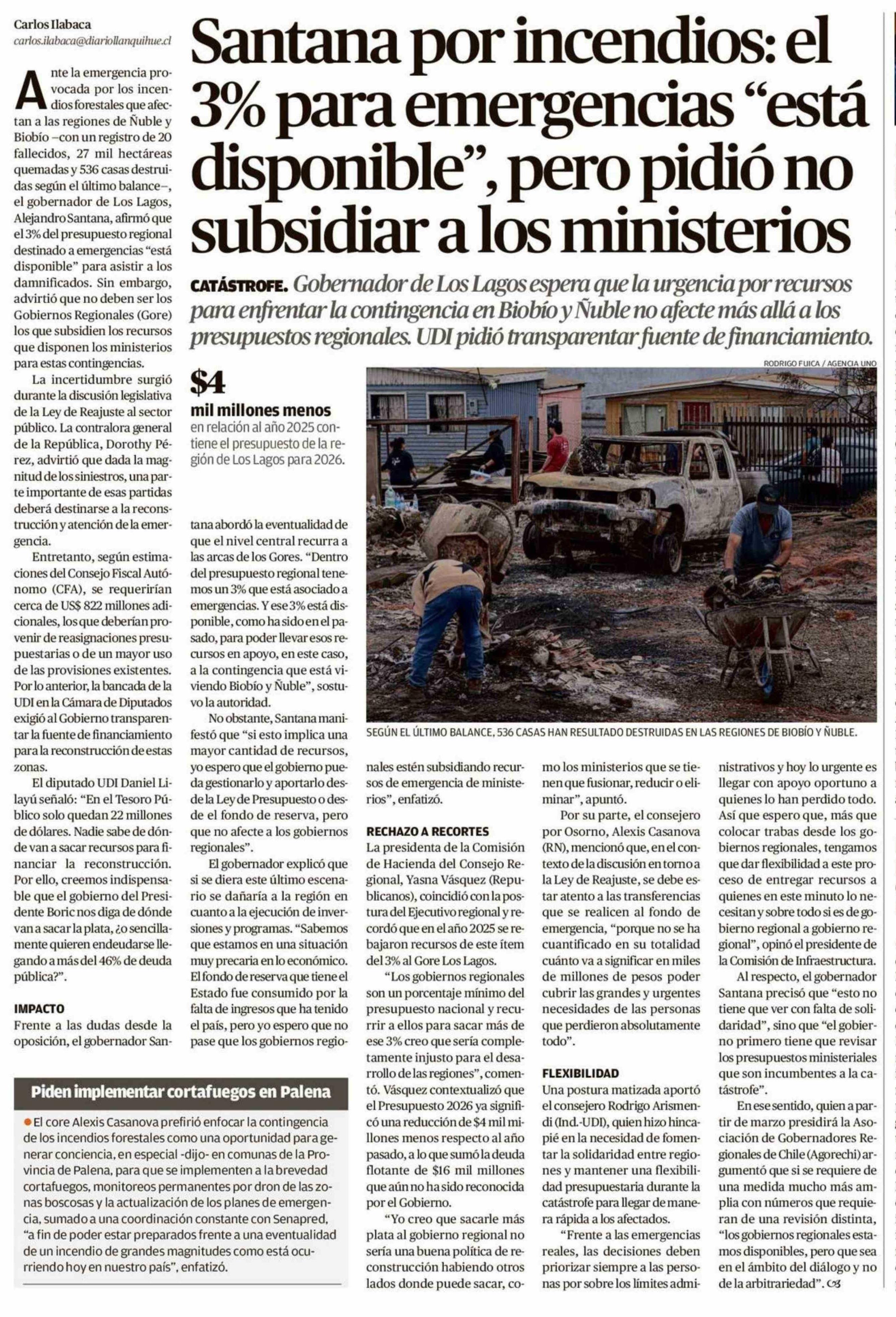 Título: Santana por incendios: el 3% para emergencias "está disponible", pero pidió no subsidiar a los ministerios