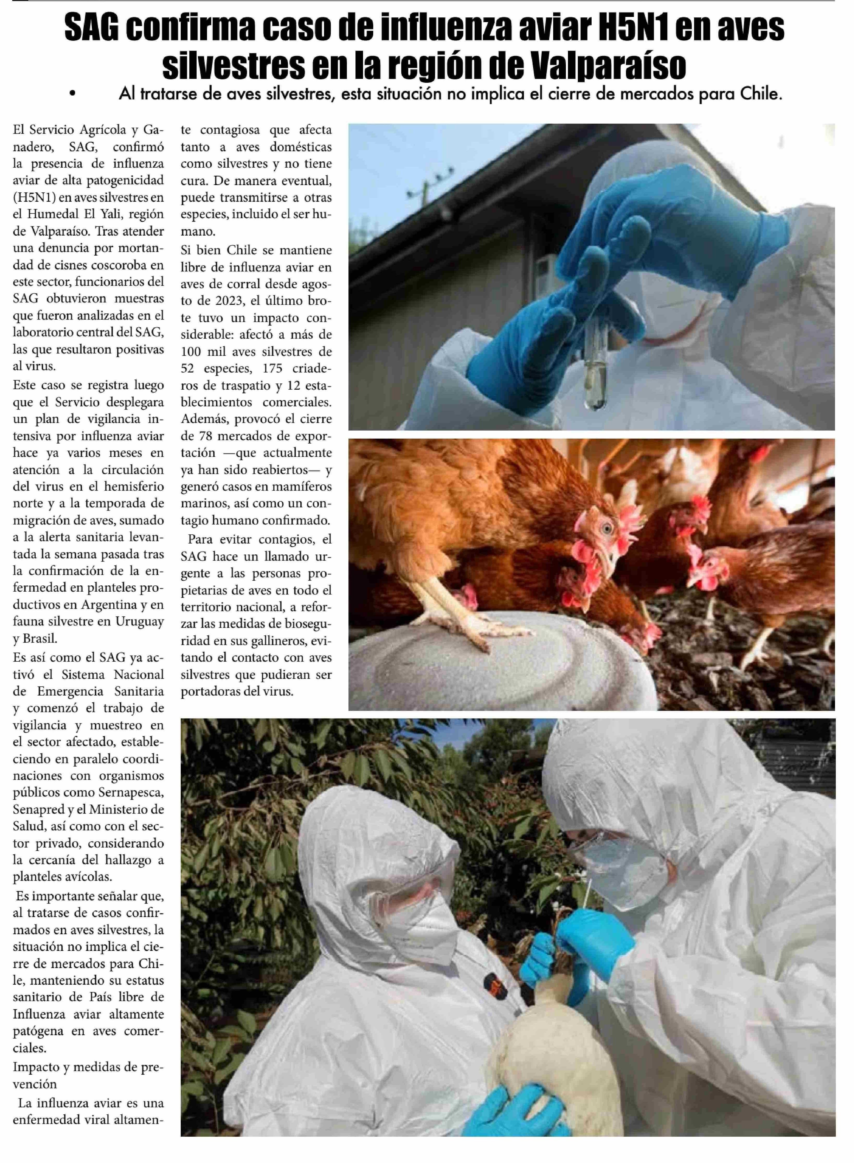 Título: SAG confirma caso de influenza aviar H5N1 en aves silvestres en la región de Valparaíso Al tratarse de aves silvestres, esta situación no implica el cierre de mercados para Chile.