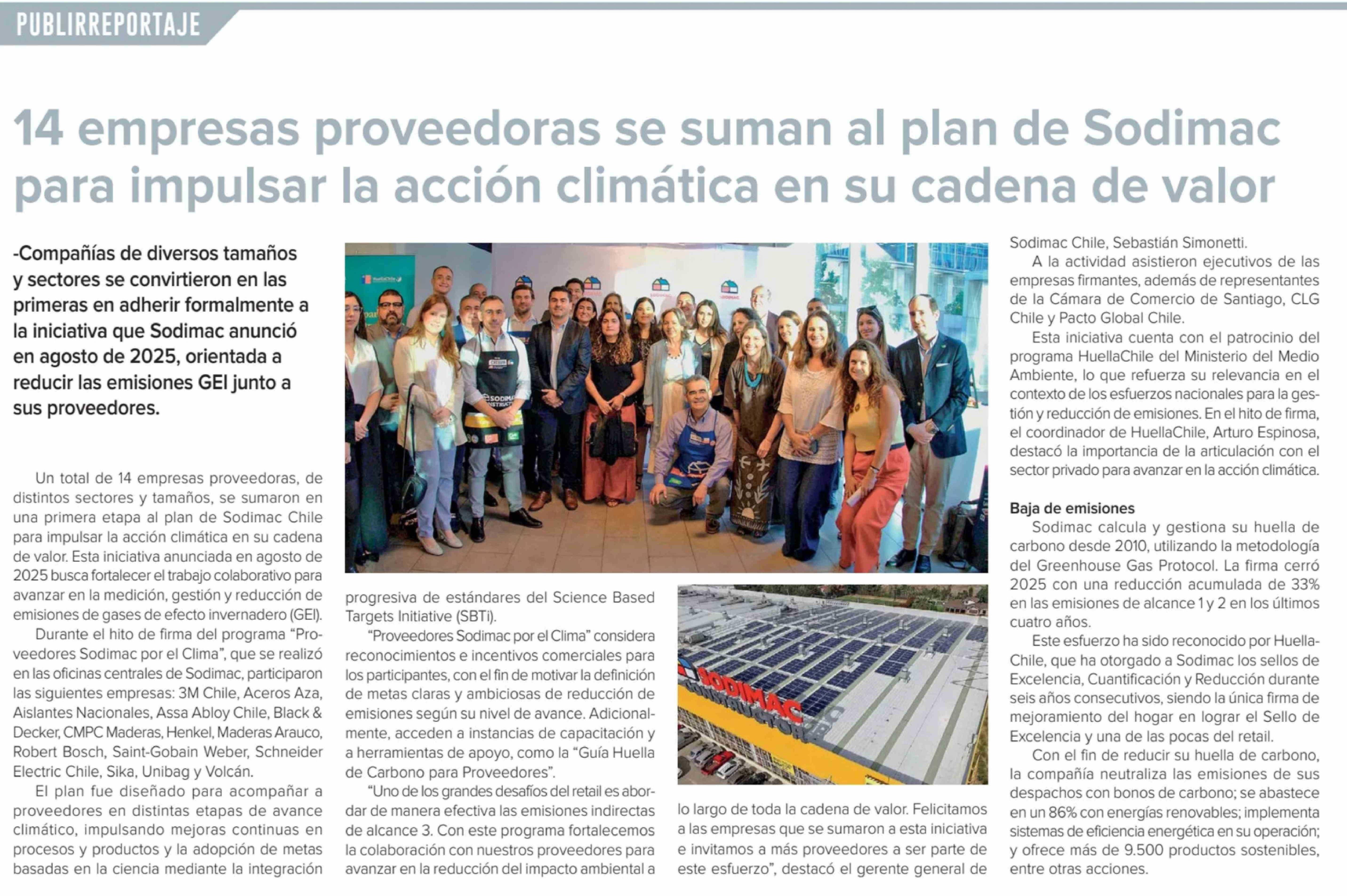 14 Empresas proveedoras se suman al plan de Sodimac para impulsar la acción climática en su cadena de valor 01-02-2026 Diario Financiero |