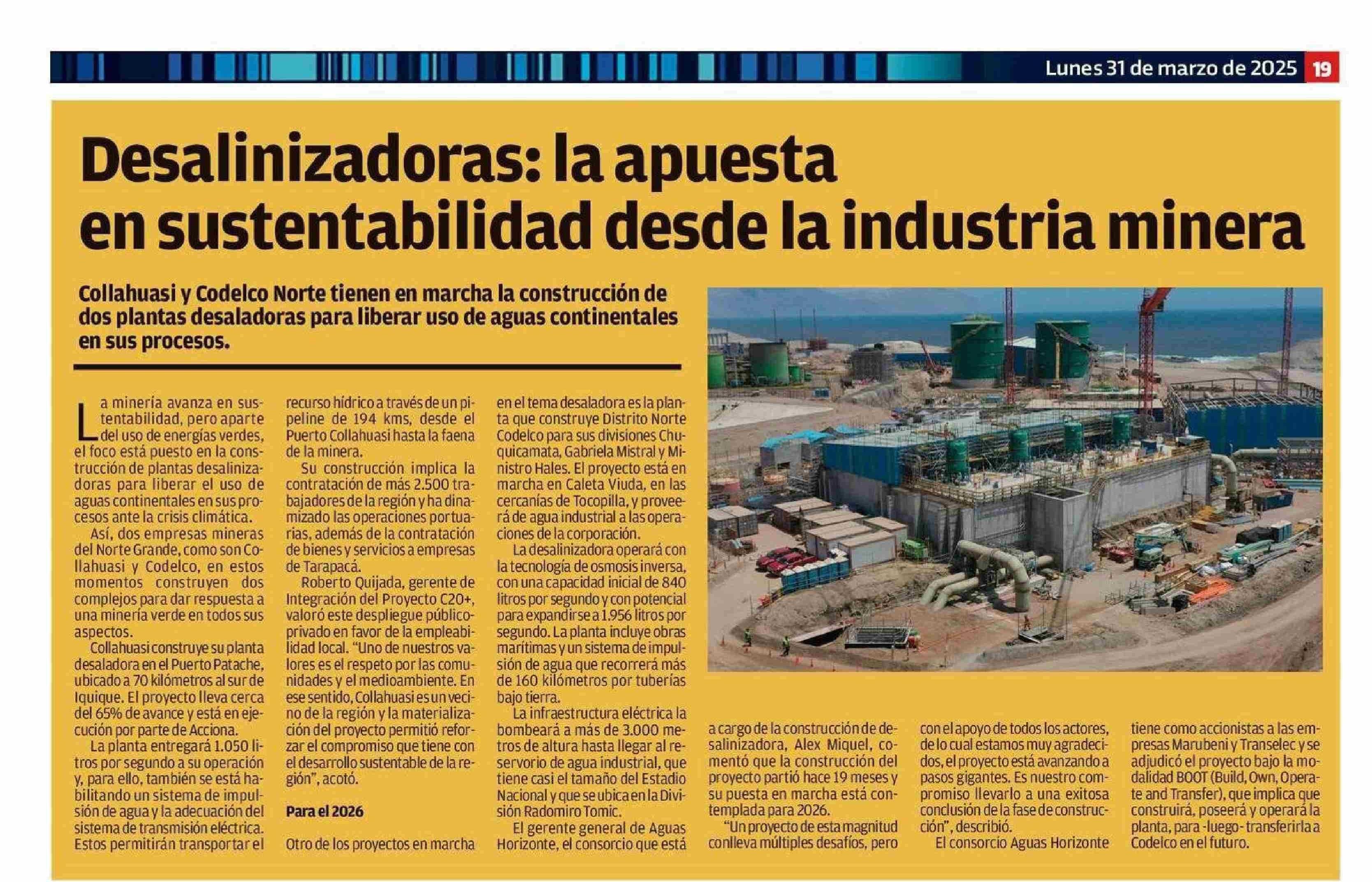 Desalinizadoras: la apuesta en sustentabilidad desde la industria minera 31-03-2025 La Estrella de Iquique |