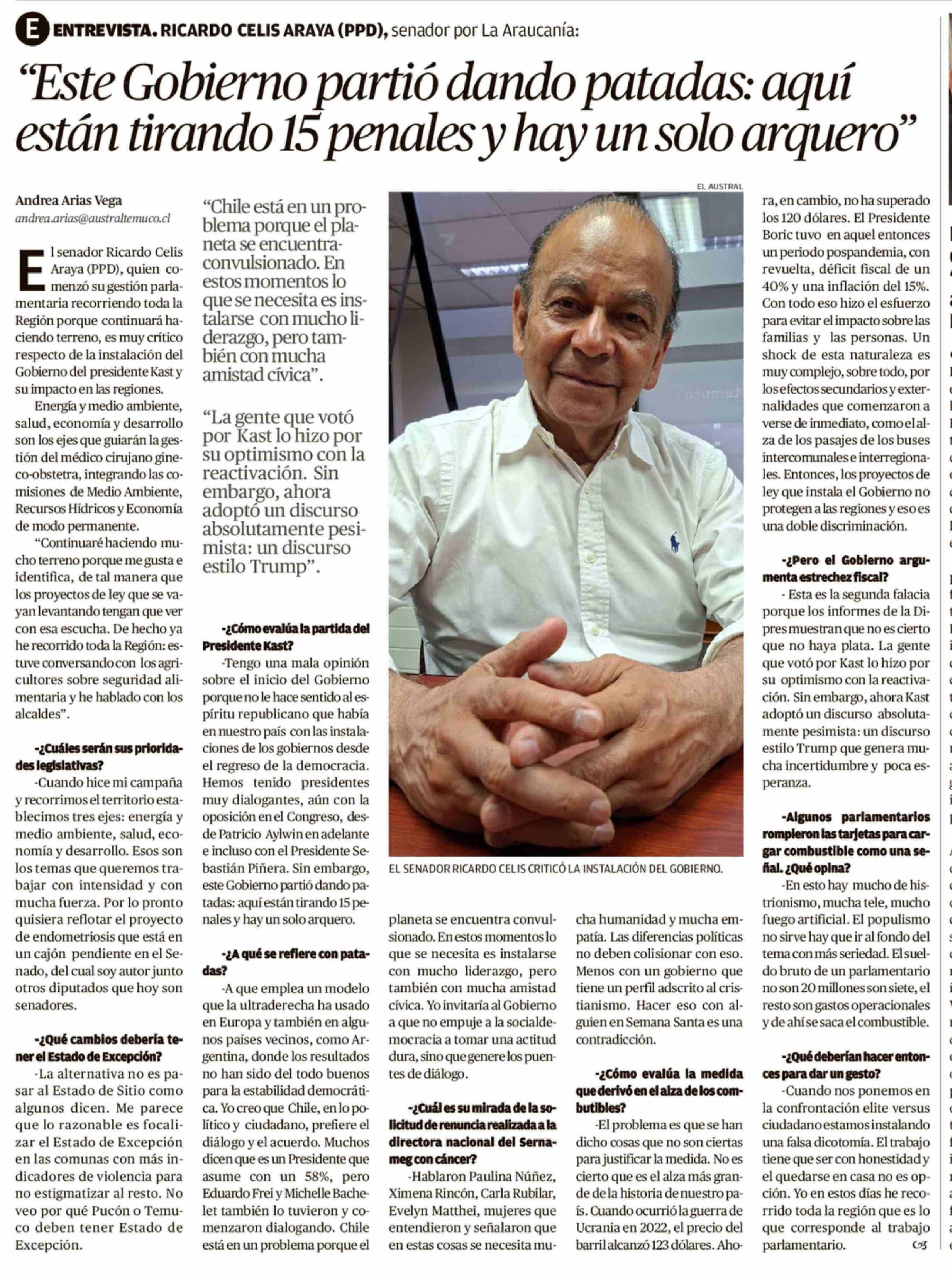 "Este Gobierno partió dando patadas: aquí están tirando 15 penales y hay un solo arquero" 04-04-2026 El Austral de la Araucanía |