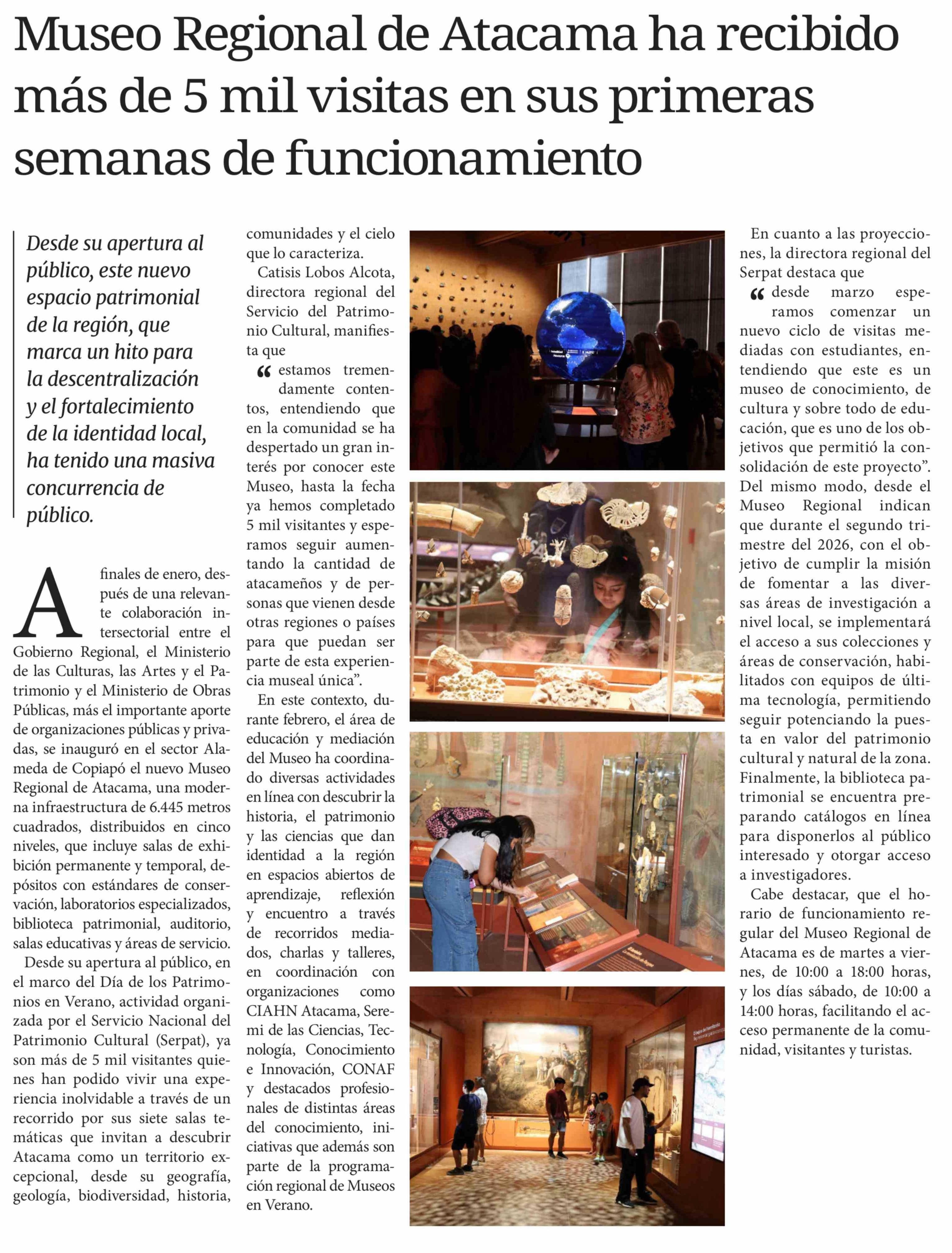 Museo Regional de Atacama ha recibido más de 5 mil visitas en sus primeras semanas de funcionamiento 28-02-2026 Diario Chañarcillo |