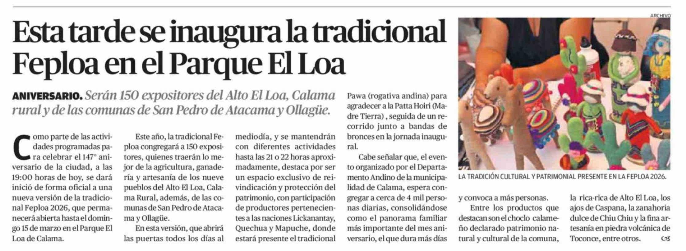 Esta tarde se inaugura la tradicional Feploa en el Parque El Loa 06-03-2026 El Mercurio de Calama |