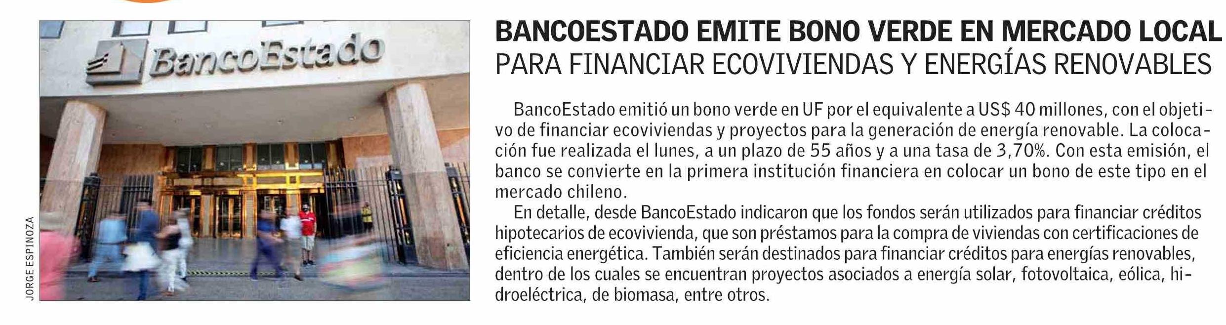 BANCOESTADO EMITE BONO VERDE EN MERCADO LOCAL PARA FINANCIAR ECOVIVIENDAS Y ENERGÍAS RENOVABLES 22-11-2023 El Mercurio |