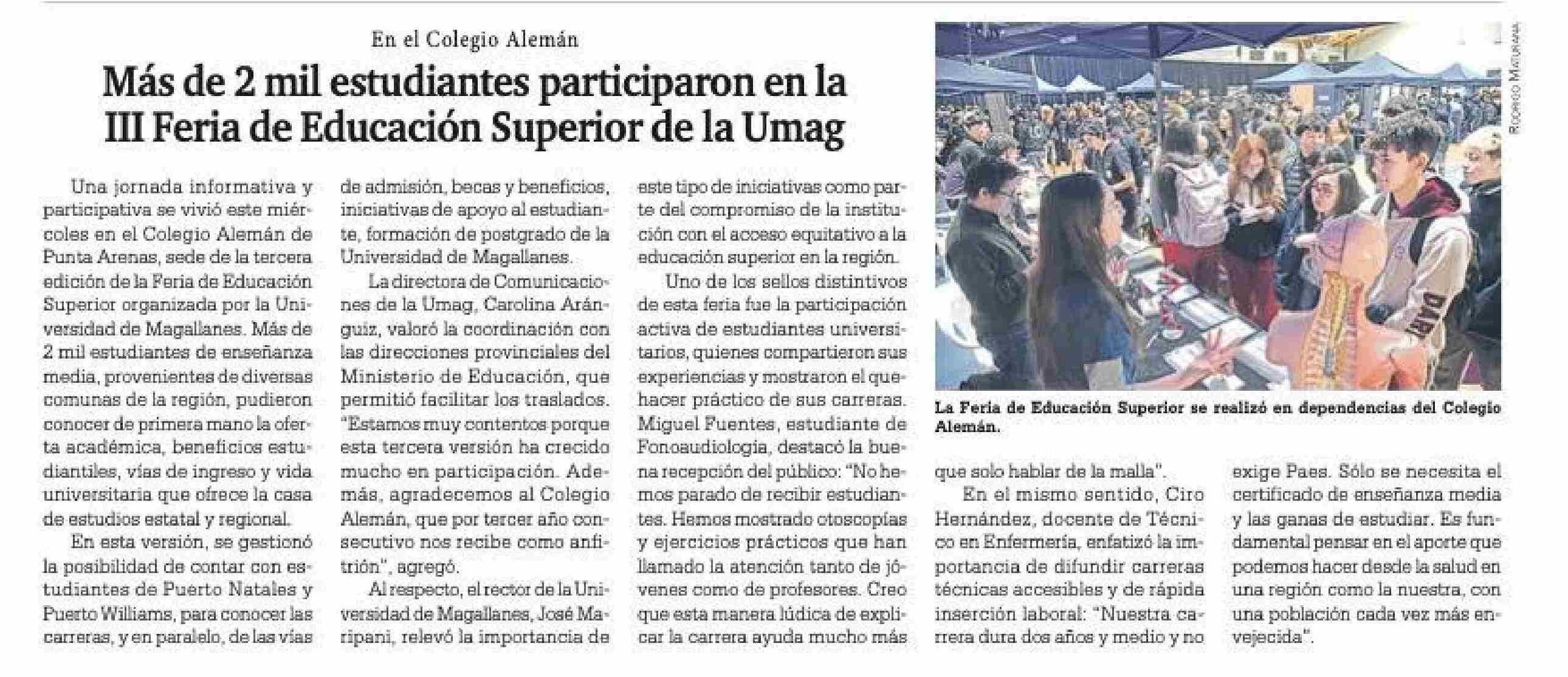 Más de 2 mil estudiantes participaron en la IN Feria de Educación Superior de la Umag 05-06-2025 La Prensa Austral |