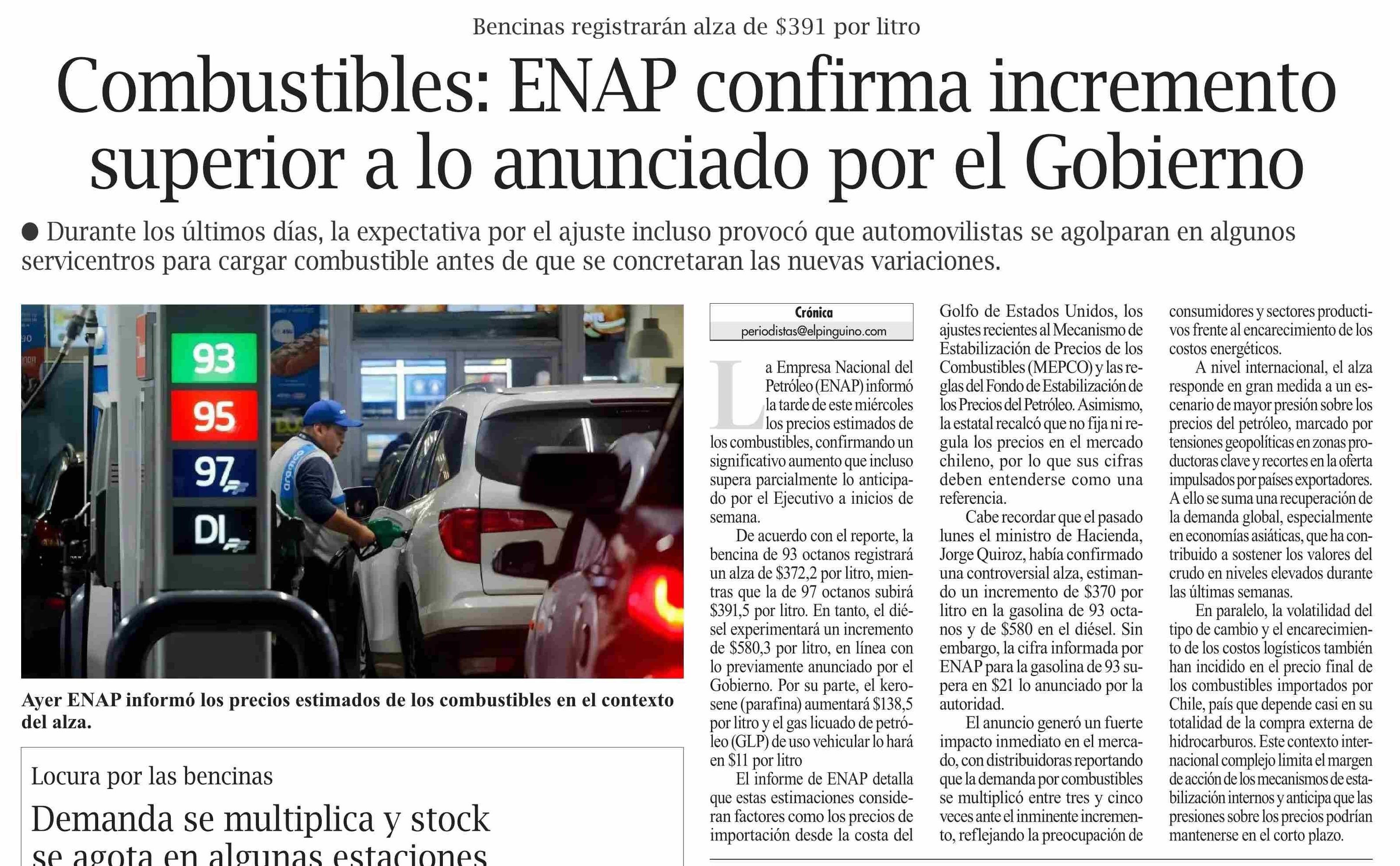 Título: Combustibles: ENAP confirma incremento superior a lo anunciado por el Gobierno