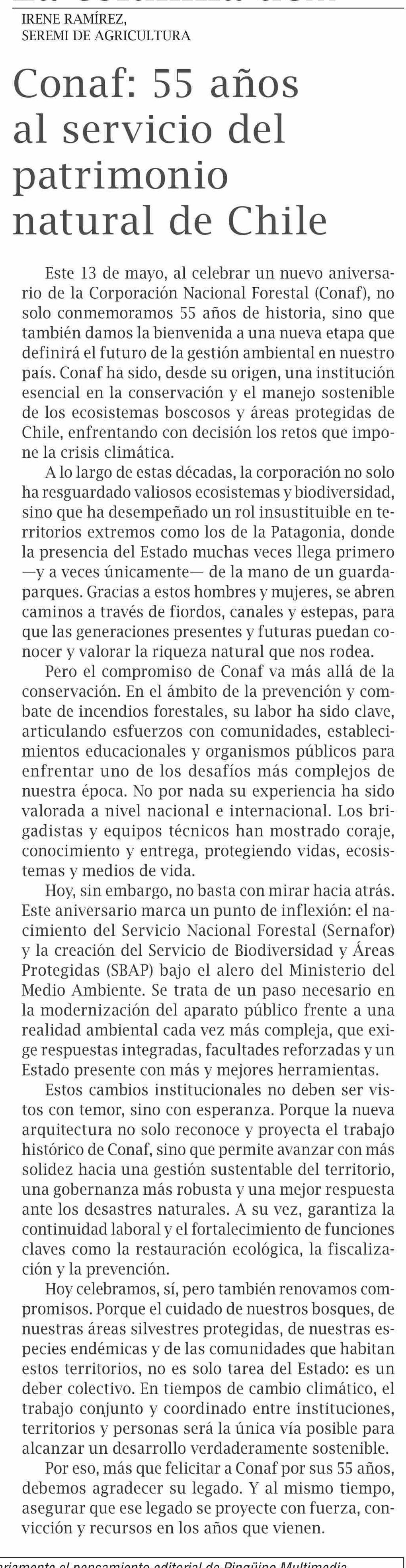 Columnas de Opinión: Conaf: 55 años al servicio del patrimonio natural de Chile 15-05-2025 El Pingüino |