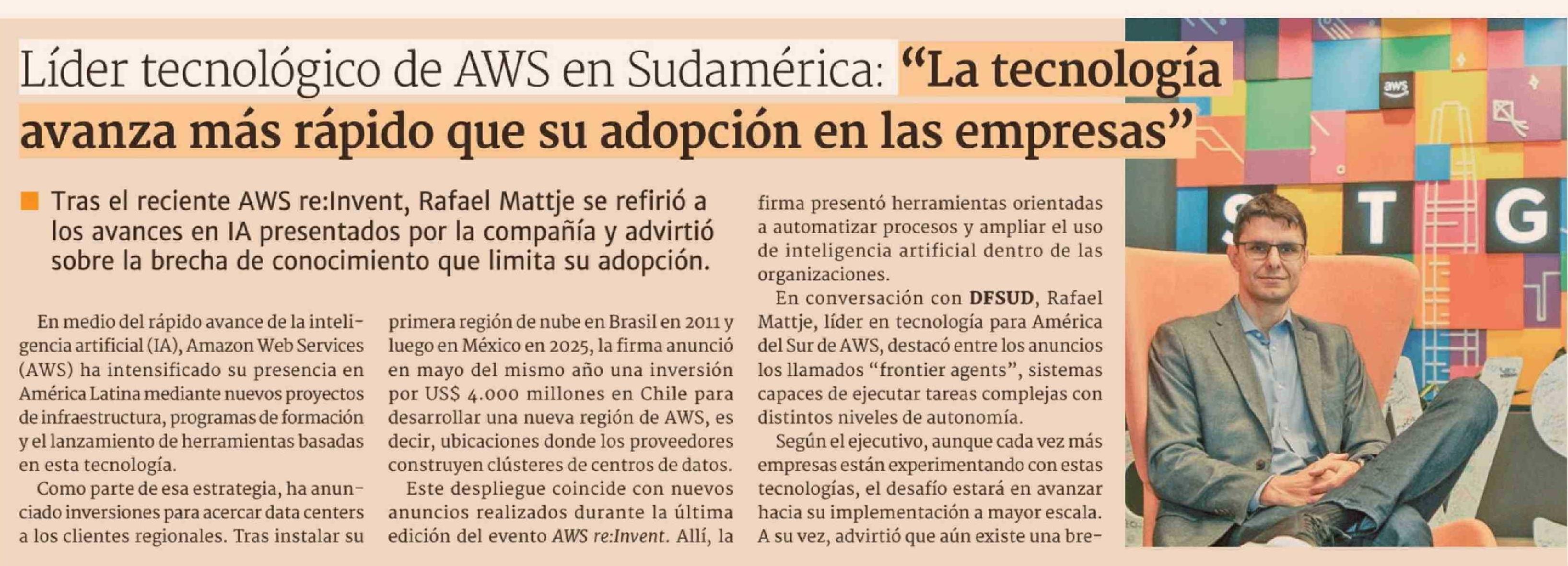 | Título: | Líder tecnológico de AWS en Sudamérica: "La tecnología avanza más rápido que su adopción en las empresas" |