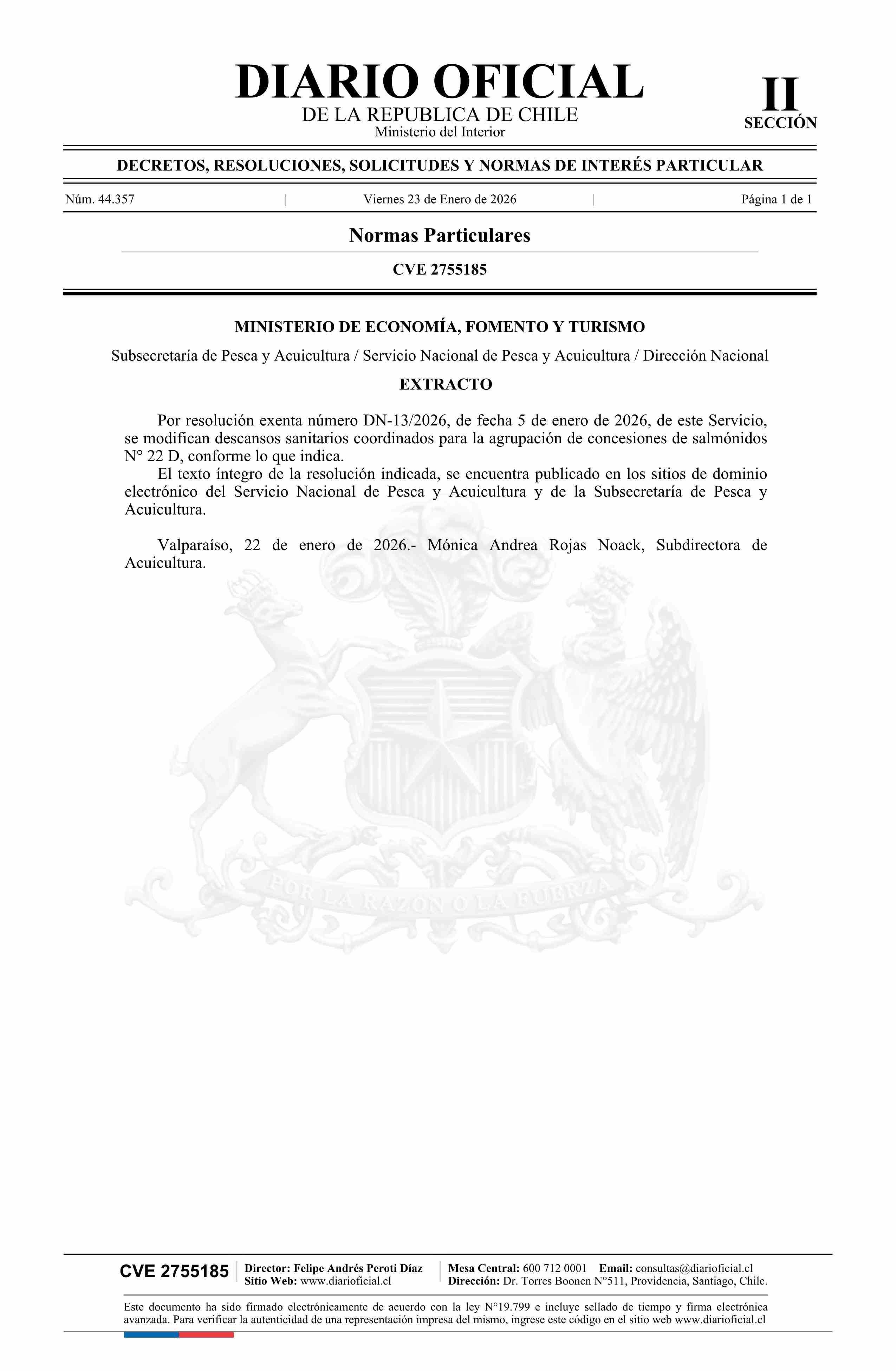 | Título: | Extracto de resolución exenta número DN-13/2026, de 2026.- Modifica descansos sanitarios para la agrupación de concesiones de salmónidos N° 22 D |