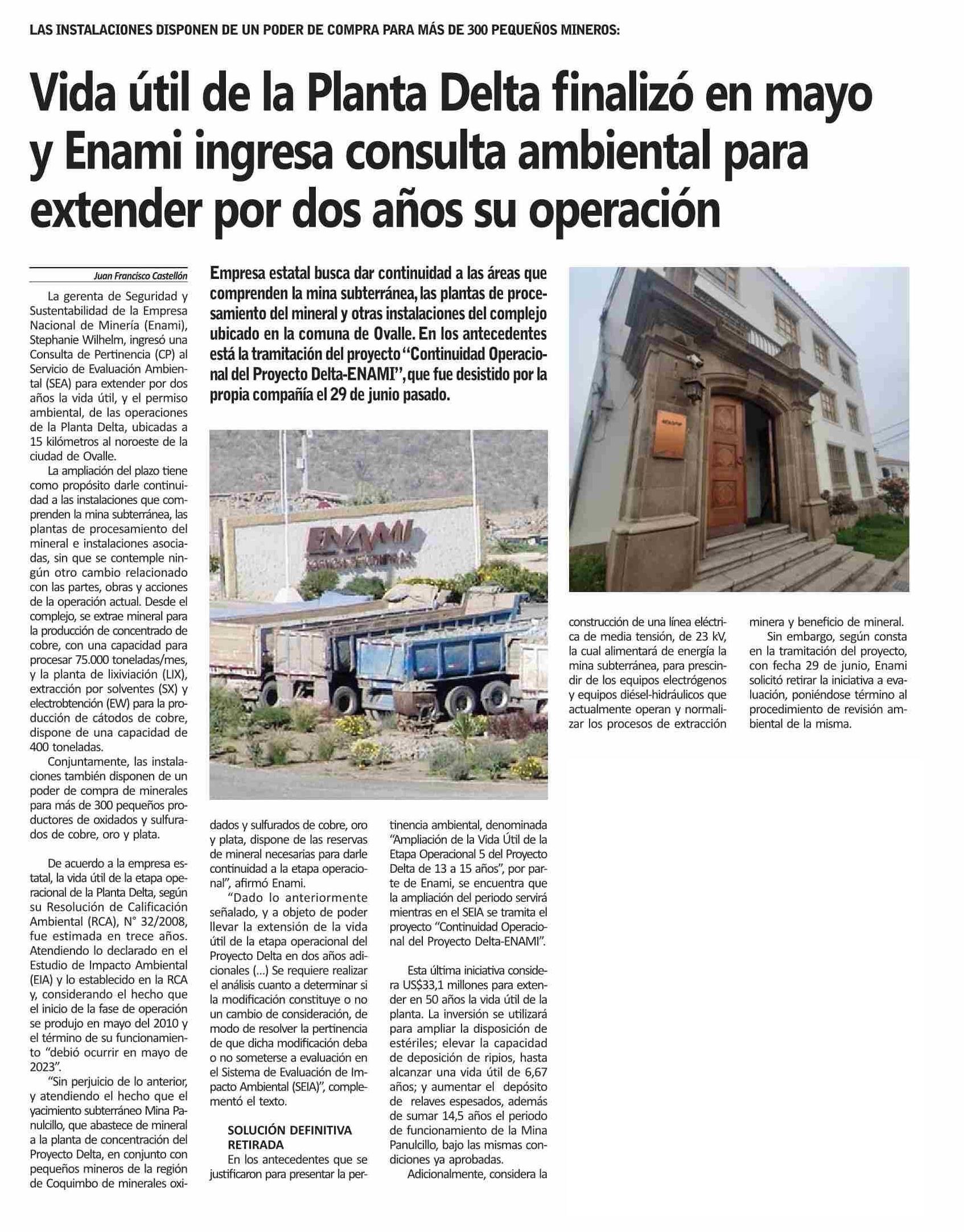 Vida útil de la Planta Delta finalizó en mayo y Enami ingresa consulta ambiental para extender por dos años su operación 28-07-2023 Semanario Tiempo |