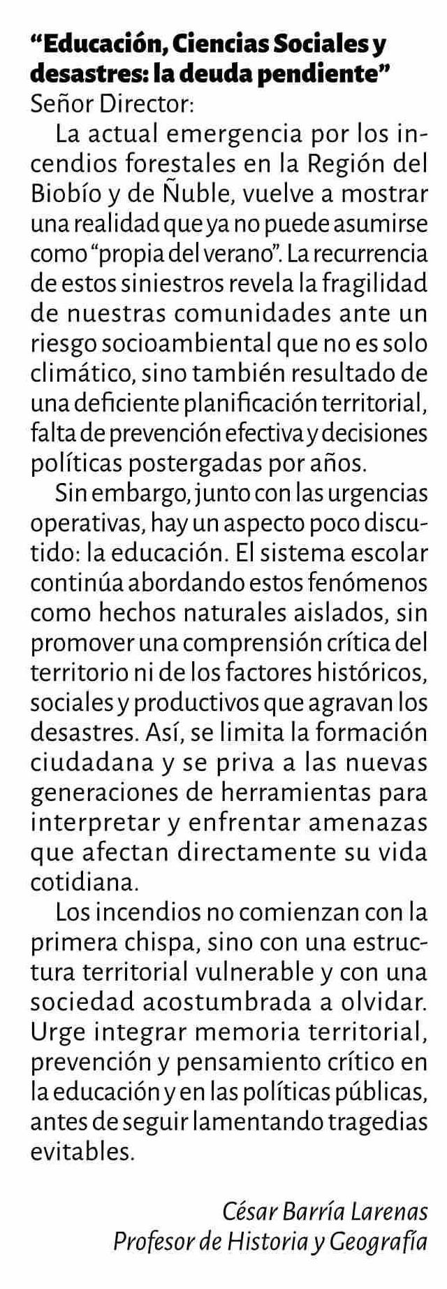 | Título: | Cartas: "Educación, Ciencias Sociales y desastres: la deuda pendiente" Señor Director: La actual emergencia por los incendios forestales en la Región del Biobio y de Nuble, vuelve a mostrar una realidad que ya no puede asumirse como "propia del verano". La recurrencia de estos siniestros revela la f |