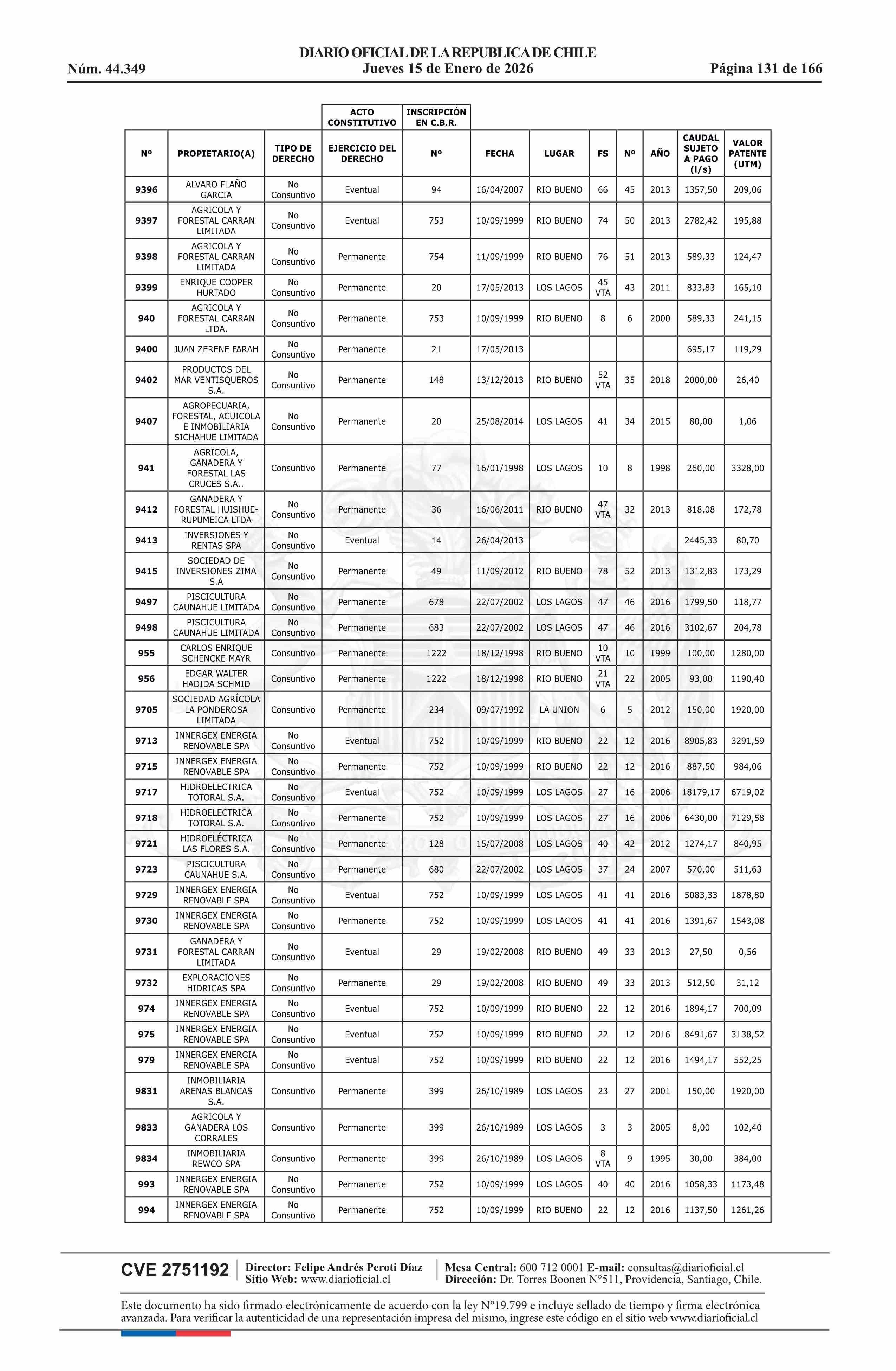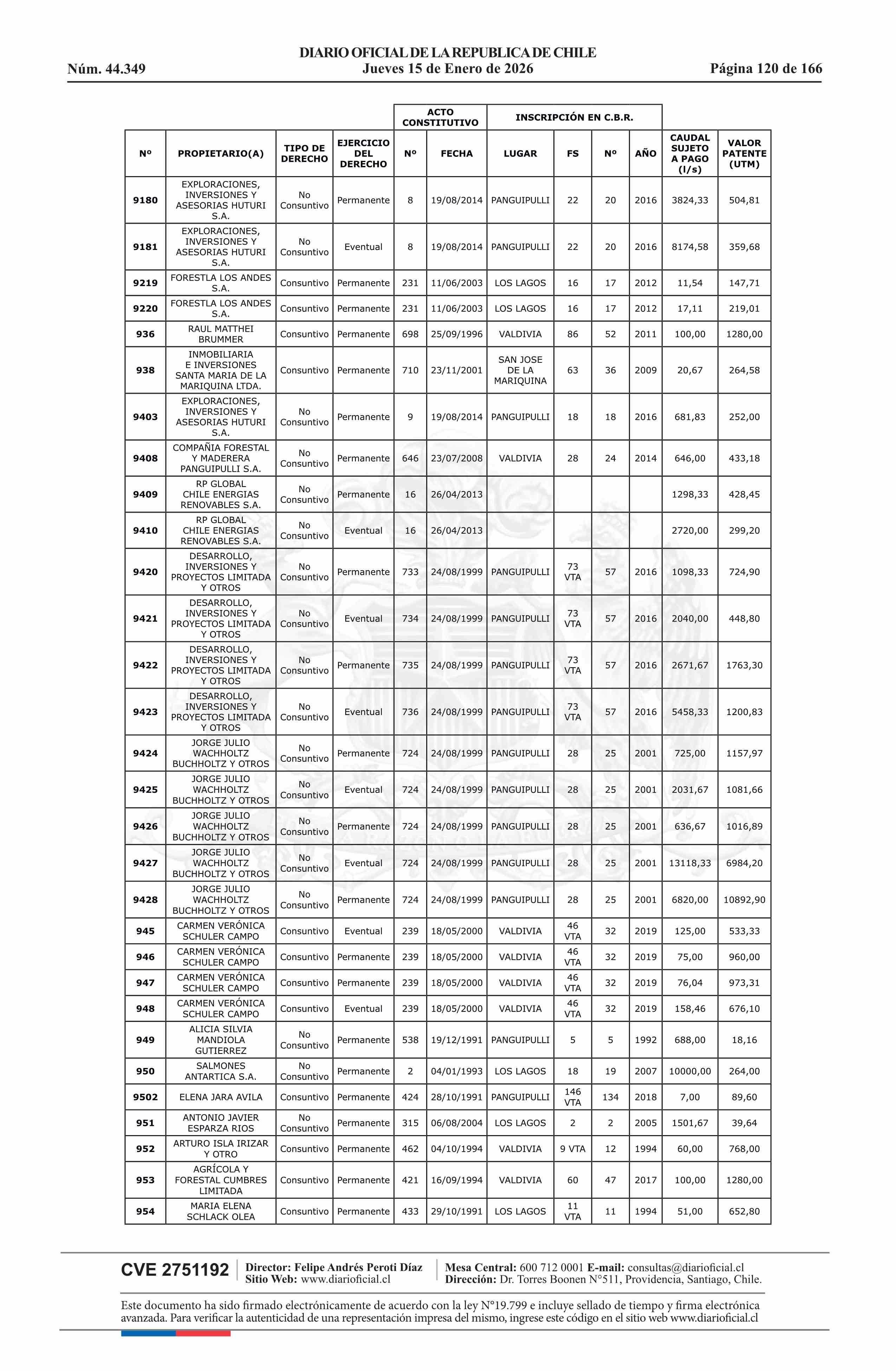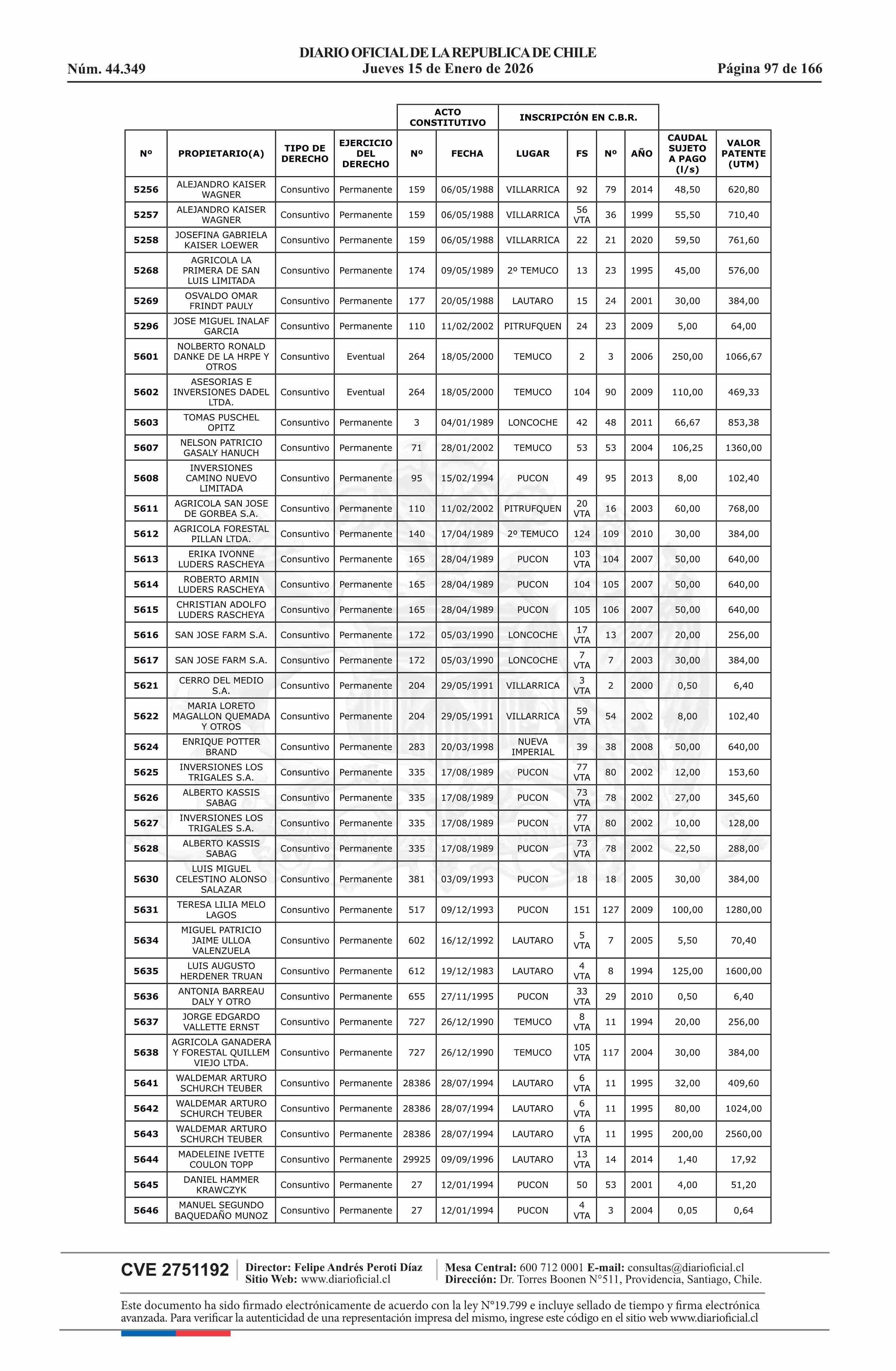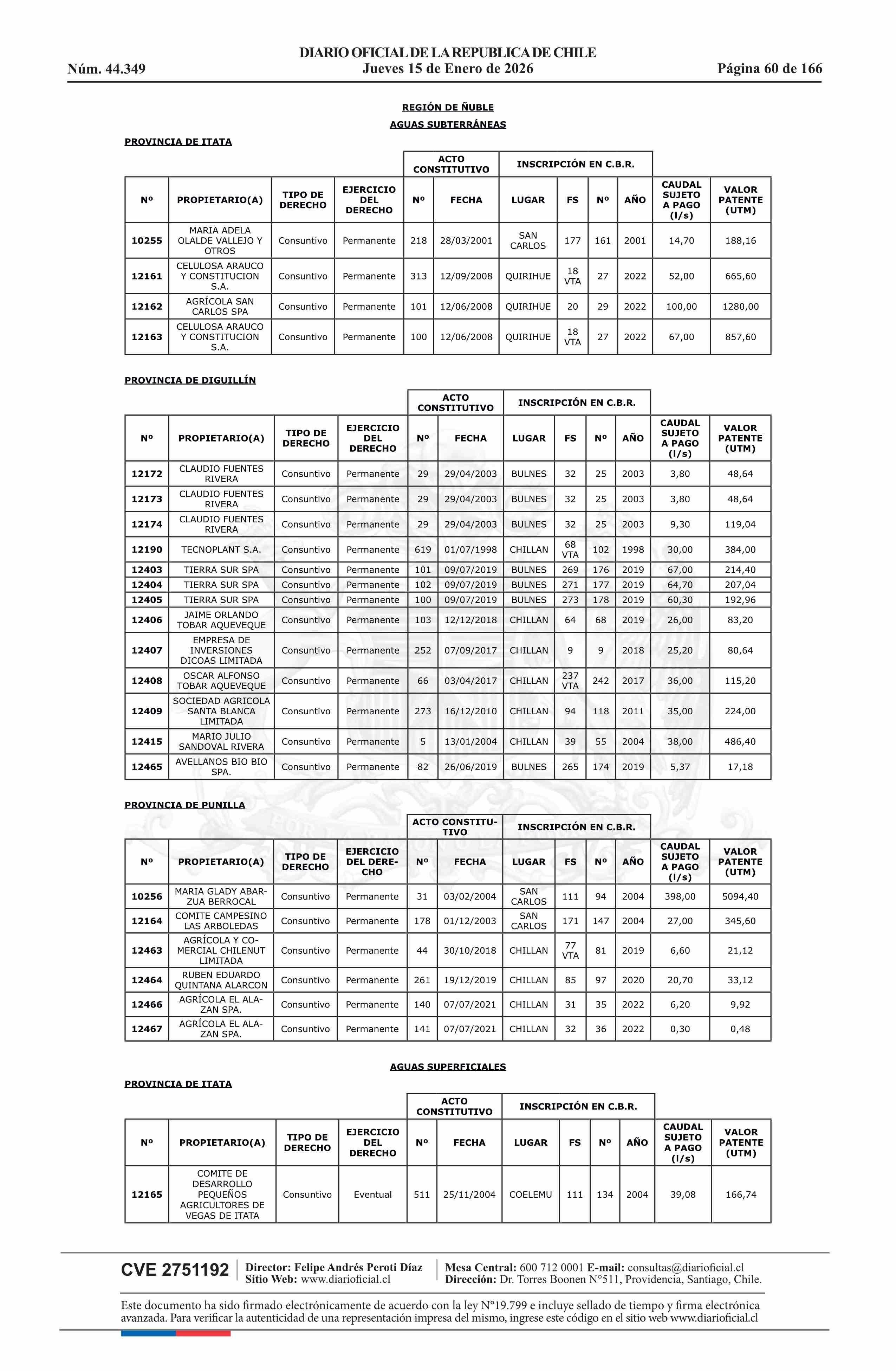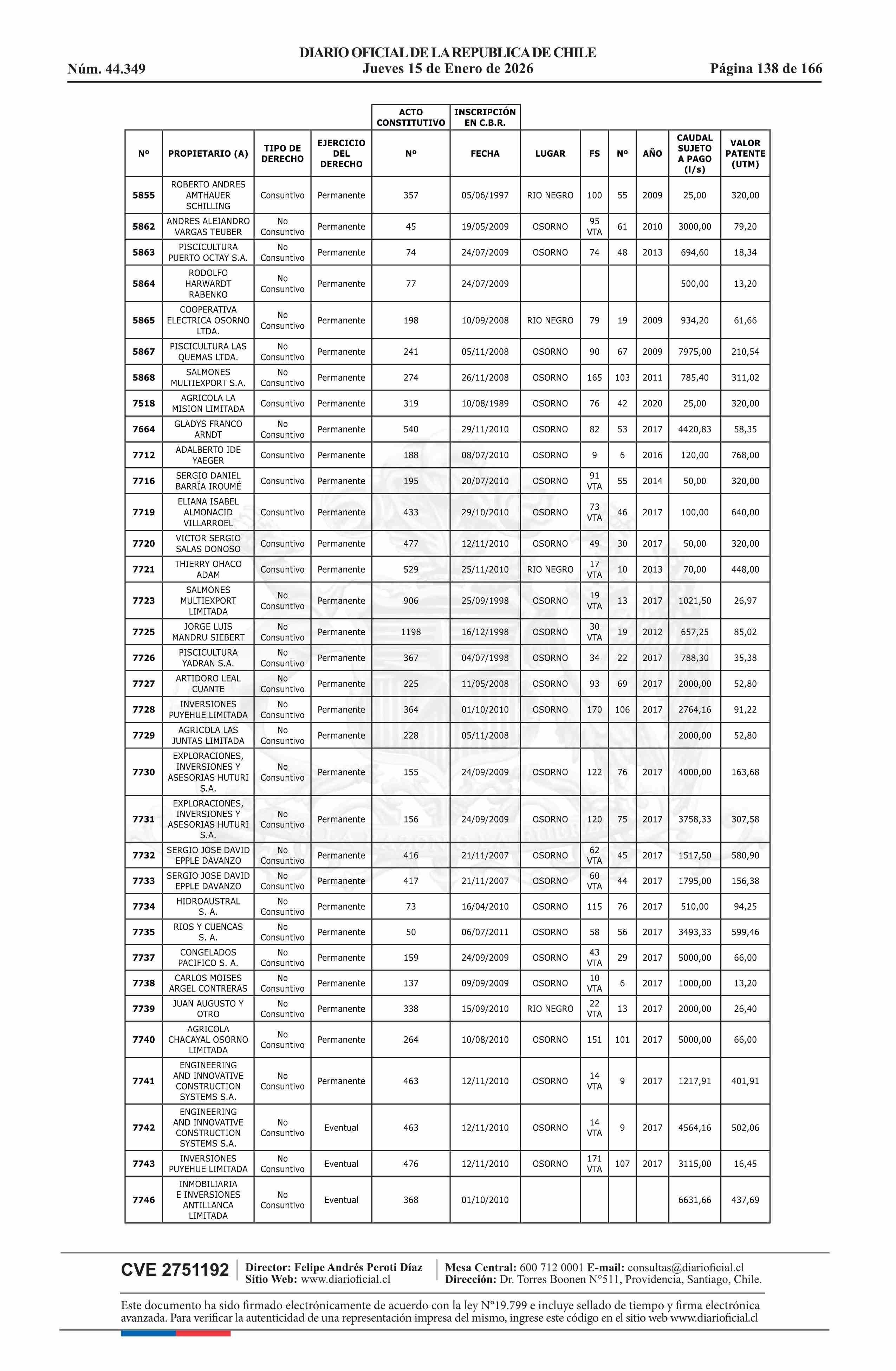 Título: Resolución exenta número 5.357, de 2025.- Fija listado de derechos de aprovechamiento de aguas afectos al pago de patente a beneficio fiscal por no utilización de las aguas, proceso 2026