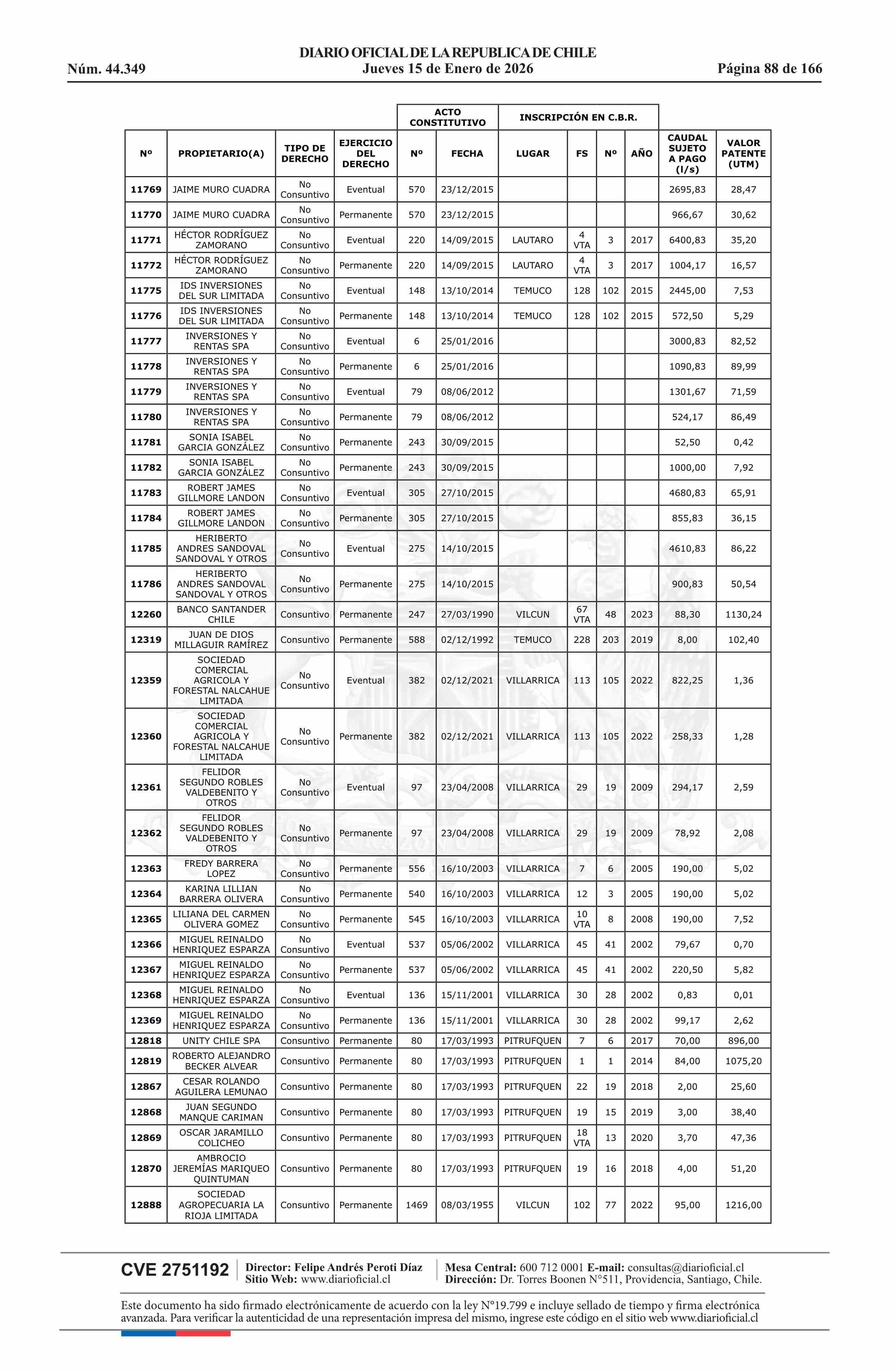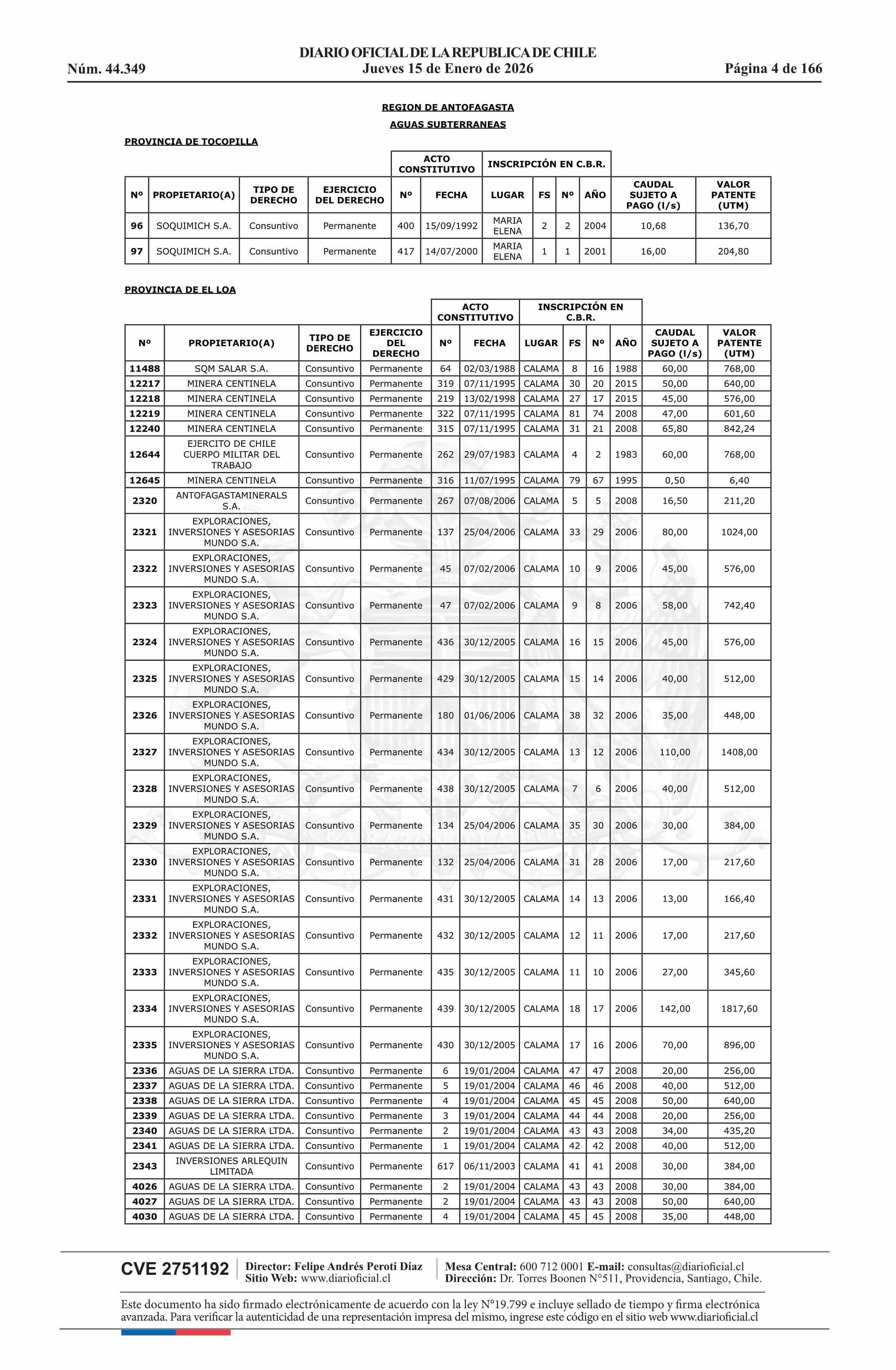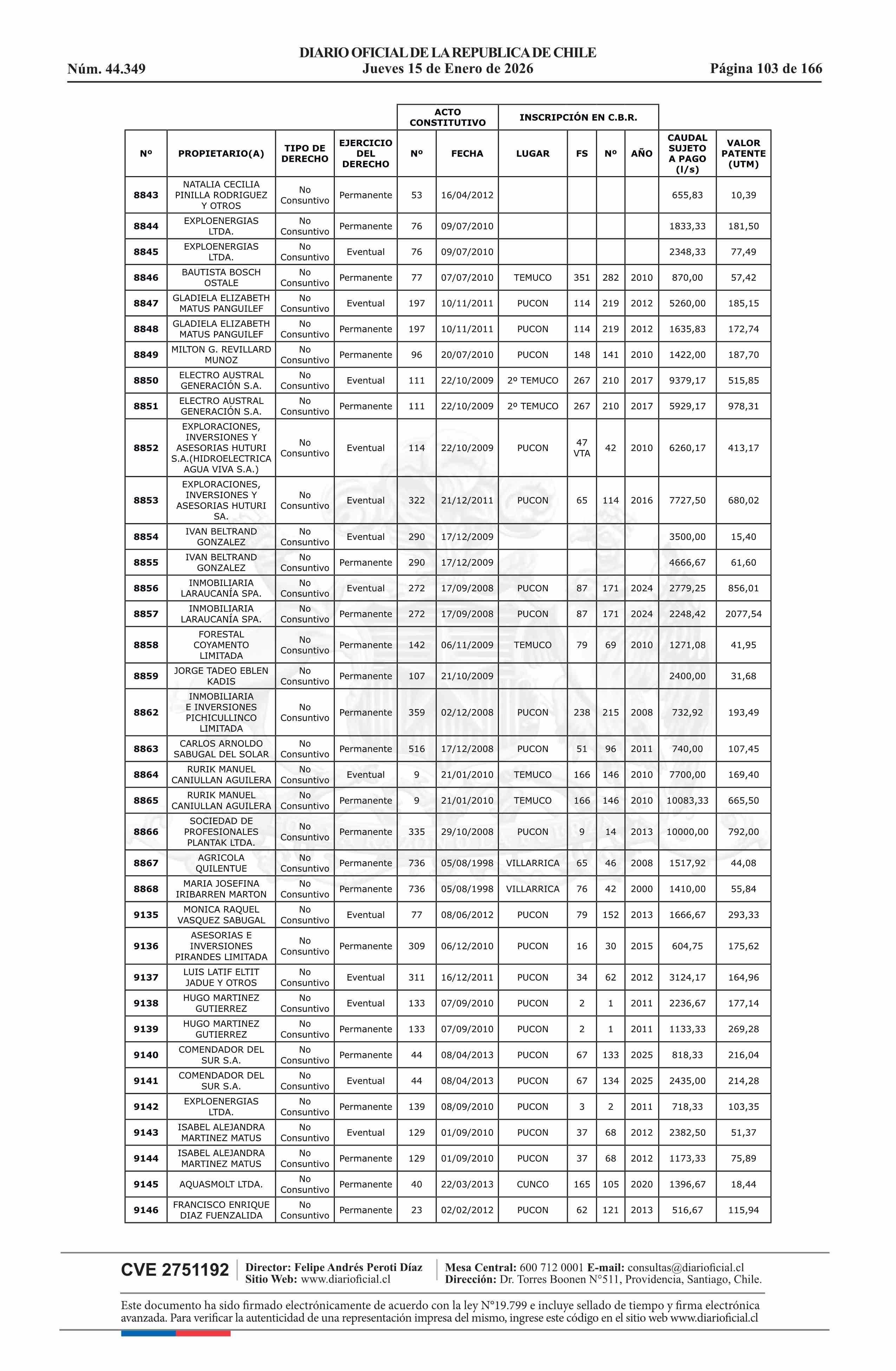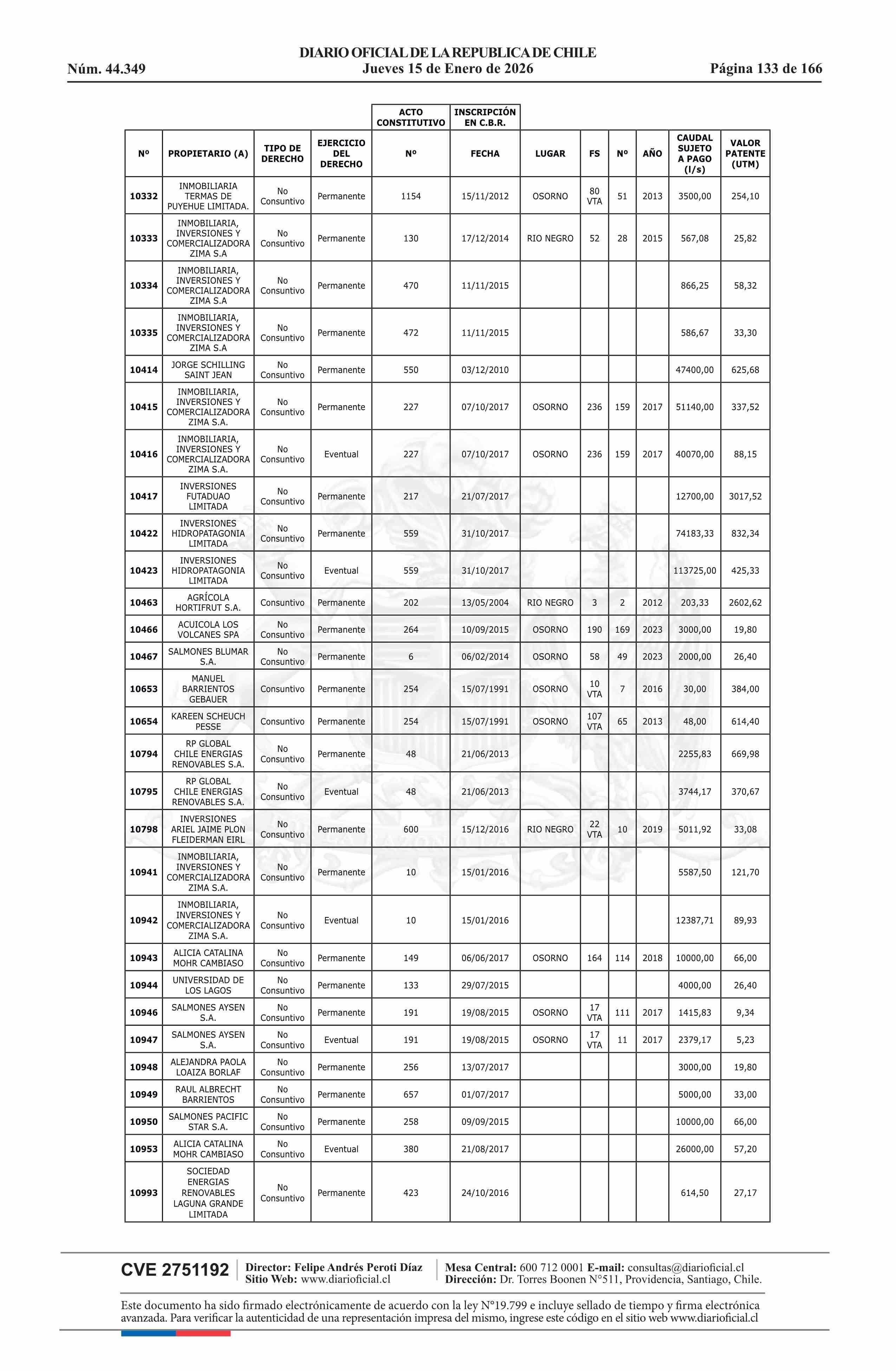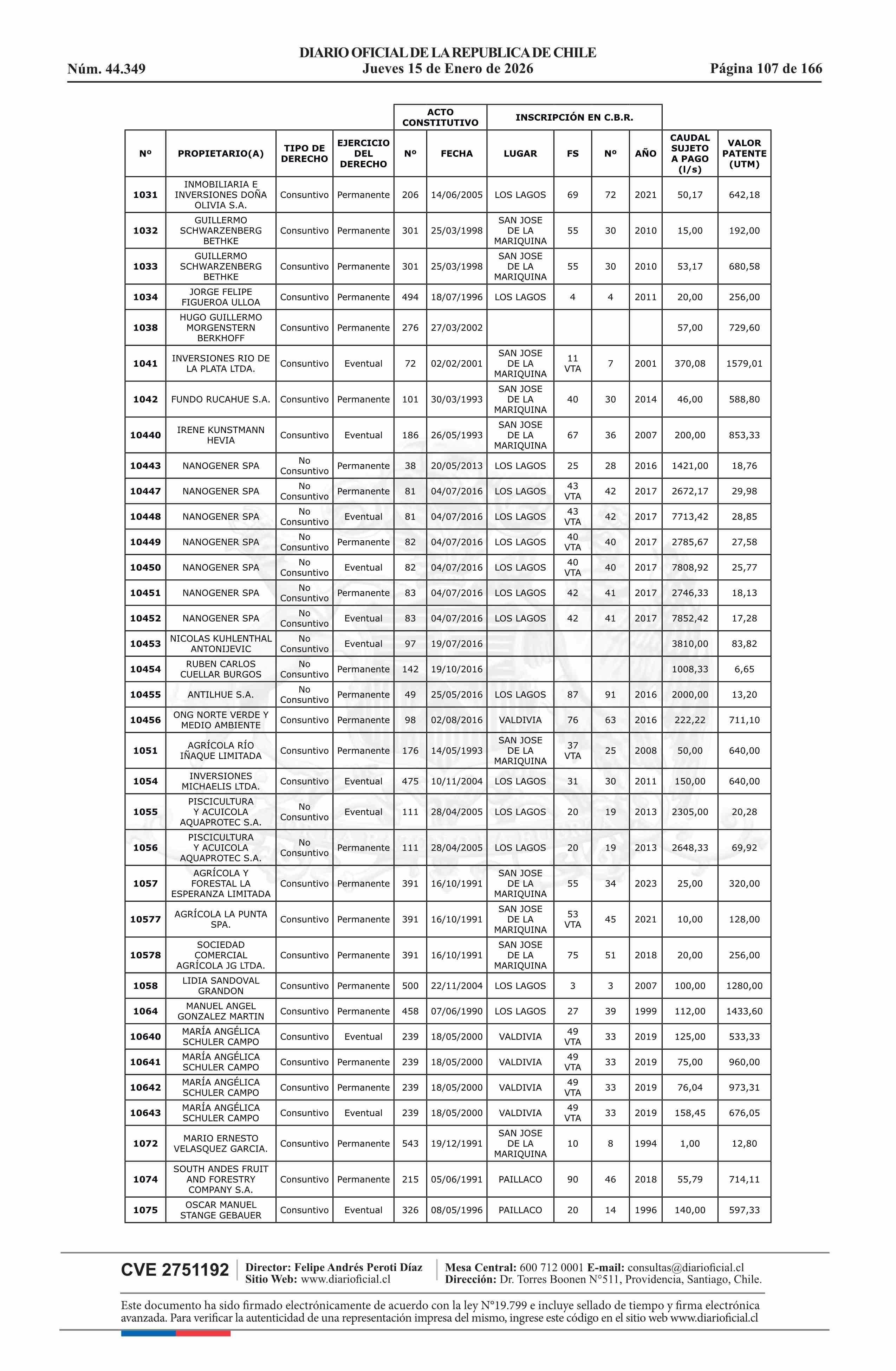 Título: Resolución exenta número 5.357, de 2025.- Fija listado de derechos de aprovechamiento de aguas afectos al pago de patente a beneficio fiscal por no utilización de las aguas, proceso 2026
