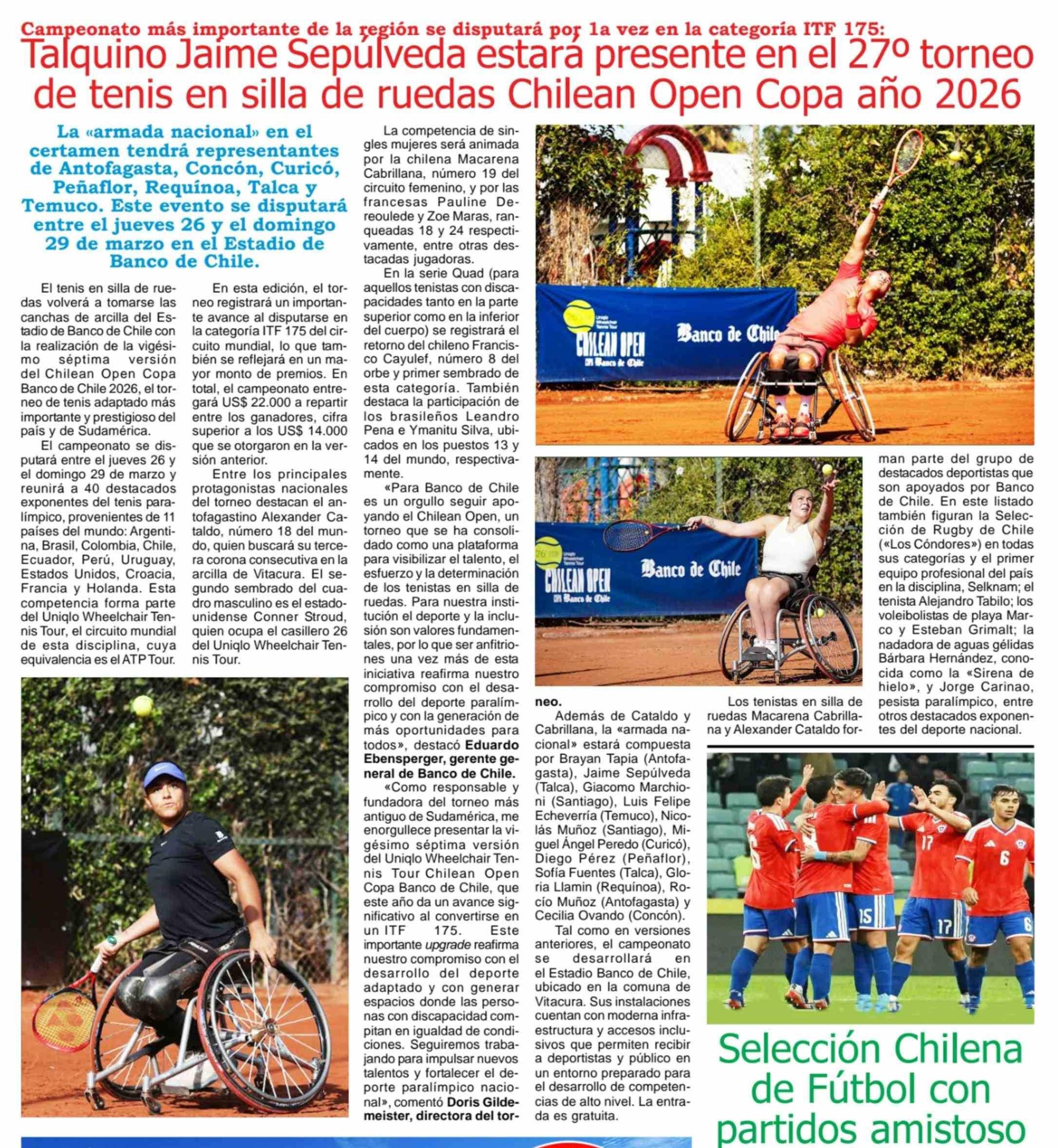 | Título: | Talquino Jaime Sepúlveda estará presente en el 27º torneo de tenis en silla de ruedas Chilean Open Copa año 2026 |