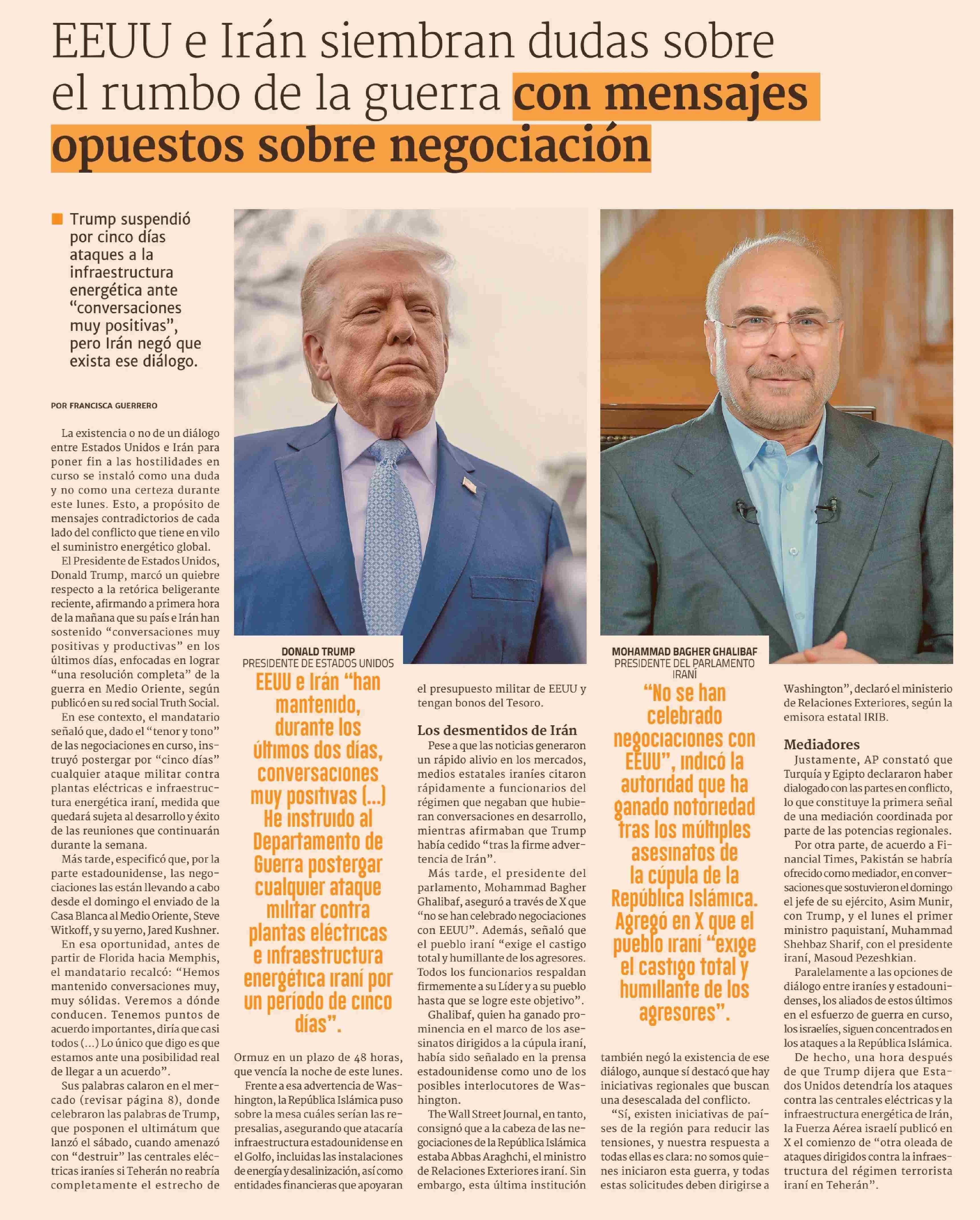 EEUU e Irán siembran dudas sobre el rumbo de la guerra con mensajes opuestos sobre negociaciones 24-03-2026 Diario Financiero |