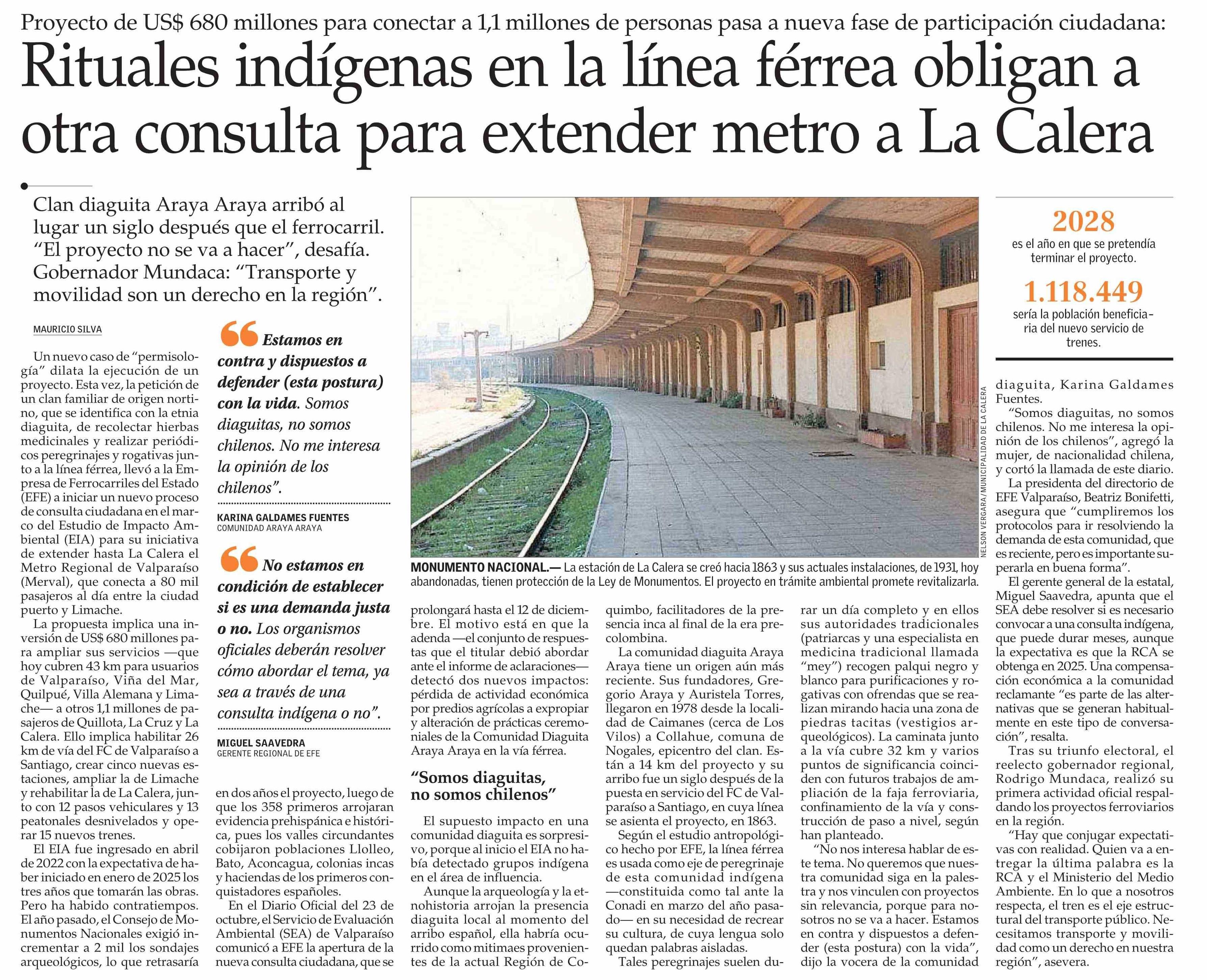Rituales indígenas en la línea férrea obligan a otra consulta para extender metro a La Calera 01-12-2024 El Mercurio |
