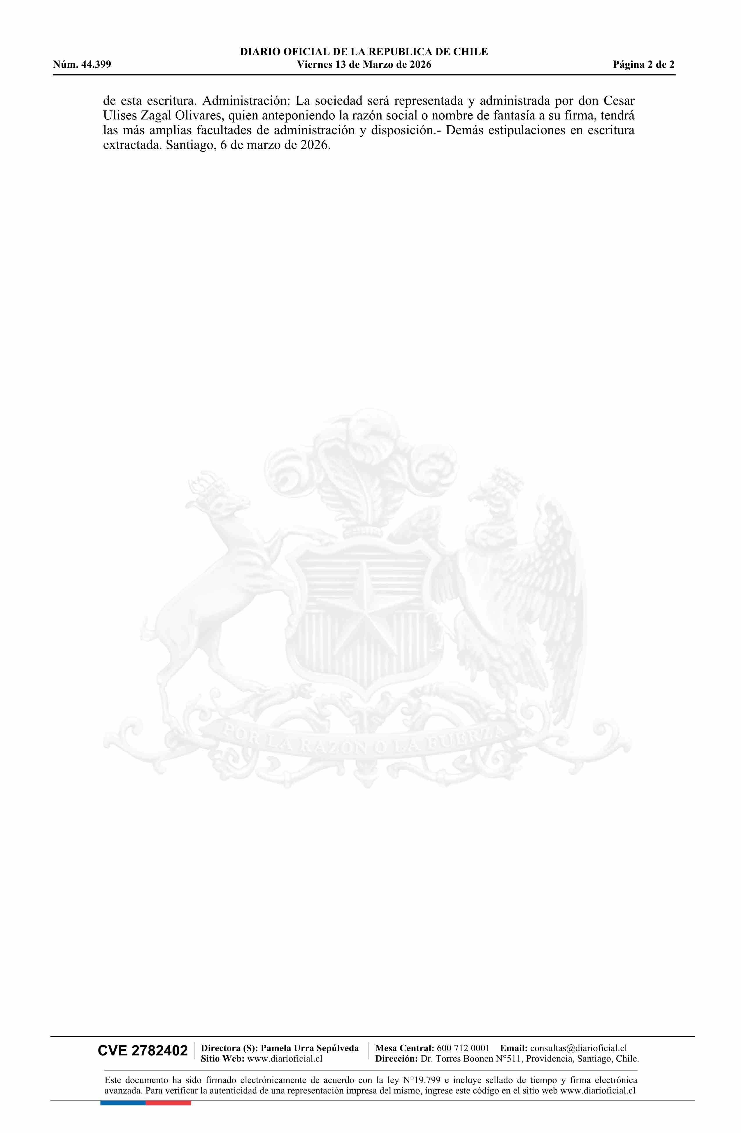 SOLUCIONES DE INFORMÁTICA CÉSAR ZAGAL SpA 13-03-2026 Diario Oficial Edición Electrónica |