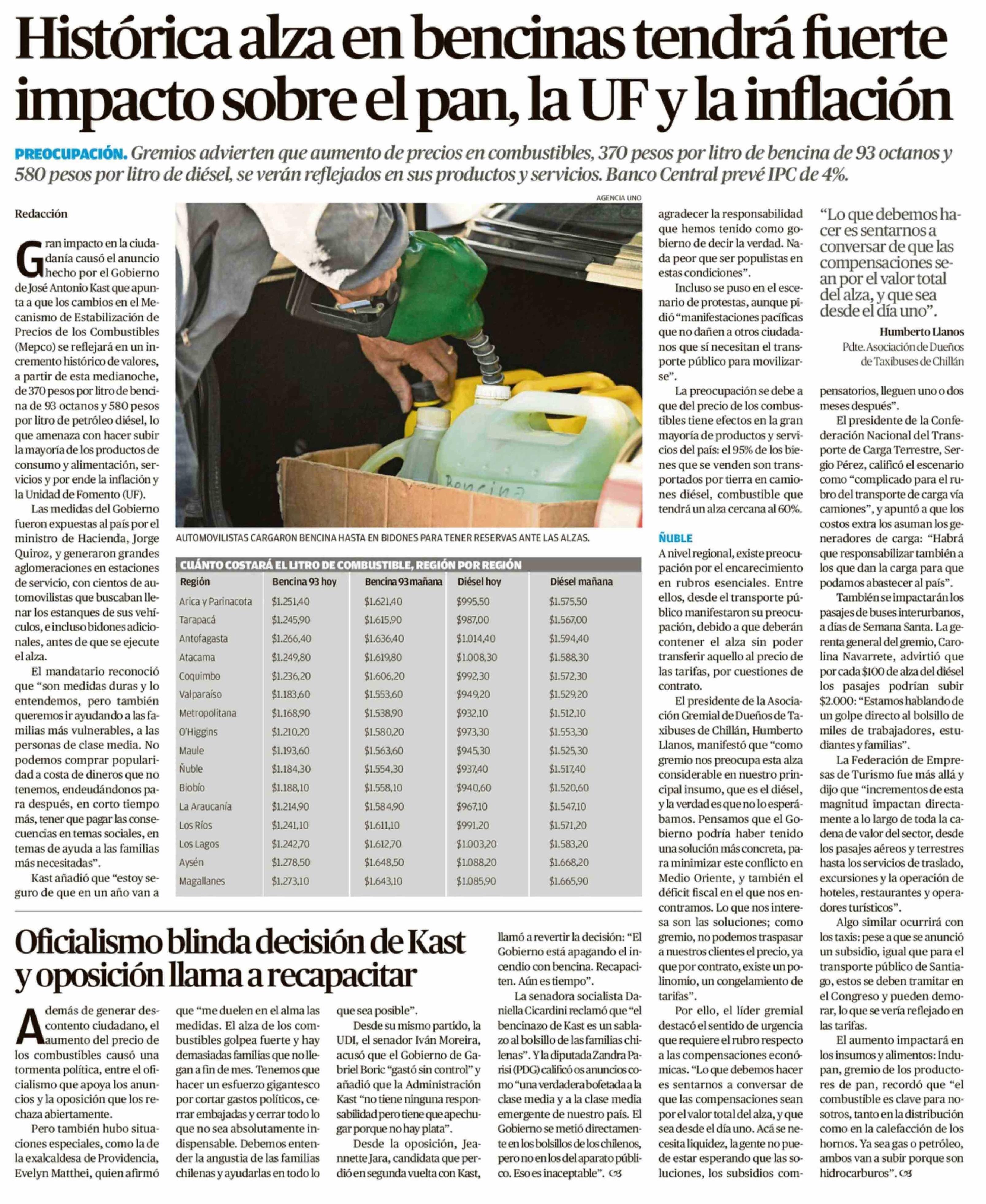 Histórica alza en bencinas tendrá fuerte impacto sobre el pan, la UF y la inflación 25-03-2026 Crónica de Chillán |