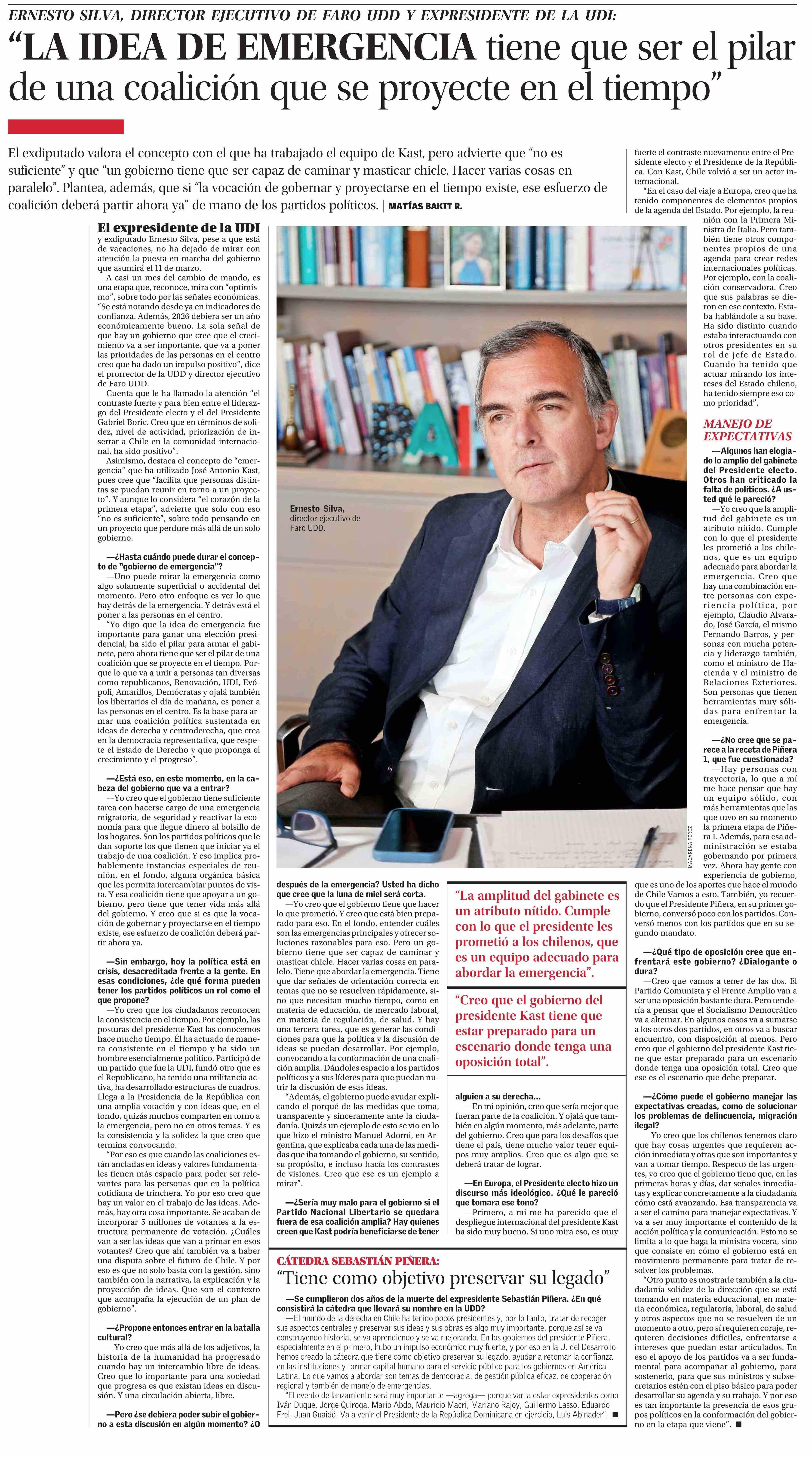 “LA IDEA DE EMERGENCIA tiene que ser el pilar de una coalición que se proyecte en el tiempo” 08-02-2026 El Mercurio |