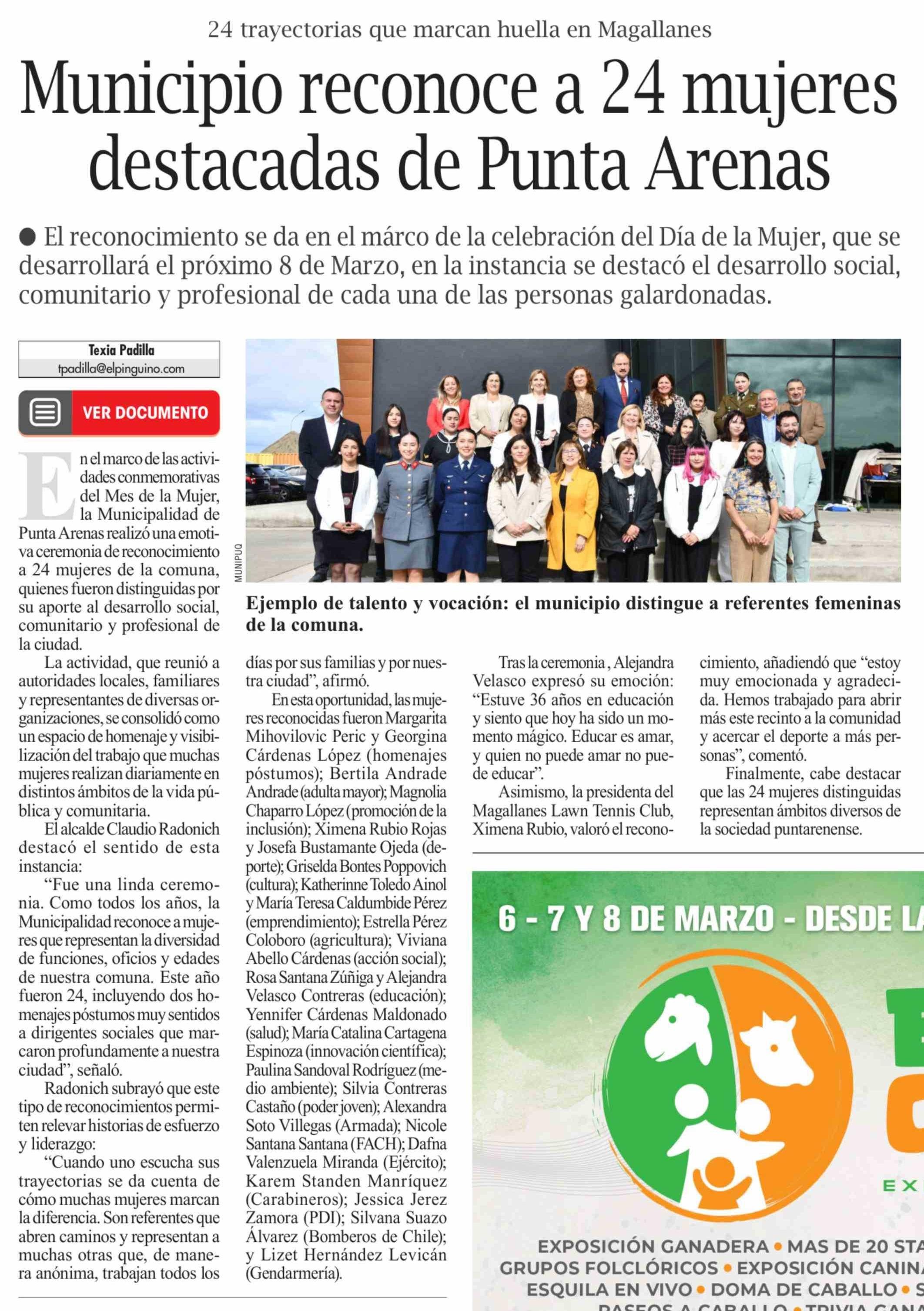 Título: Municipio reconoce a 24 mujeres destacadas de Punta Arenas
