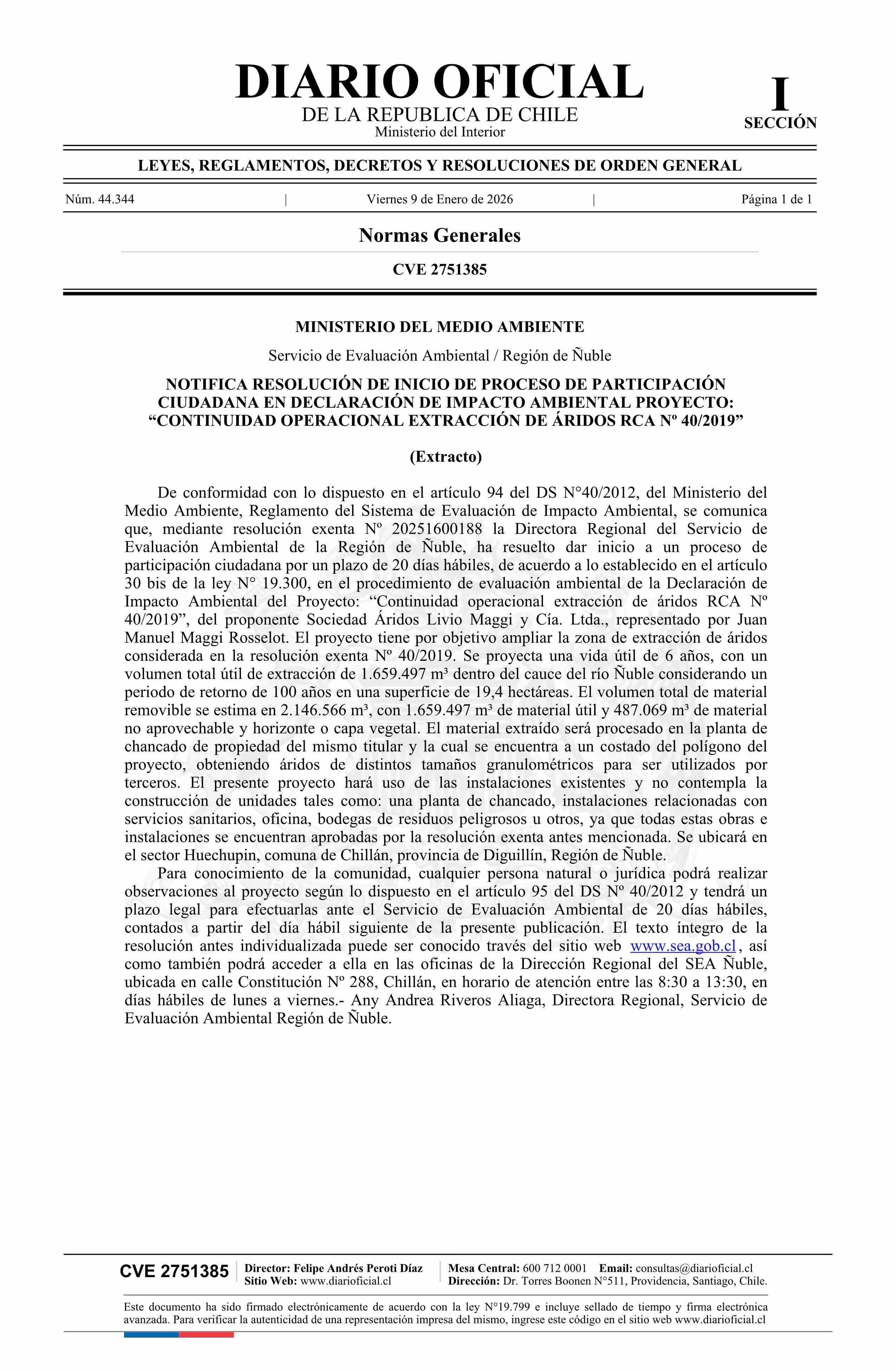 | Título: | Extracto de resolución exenta número 20251600188, de 2025.- Inicia proceso de participación ciudadana en Declaración de Impacto Ambiental del proyecto Continuidad Operacional Extracción de Áridos RCA N° 40/2019 |