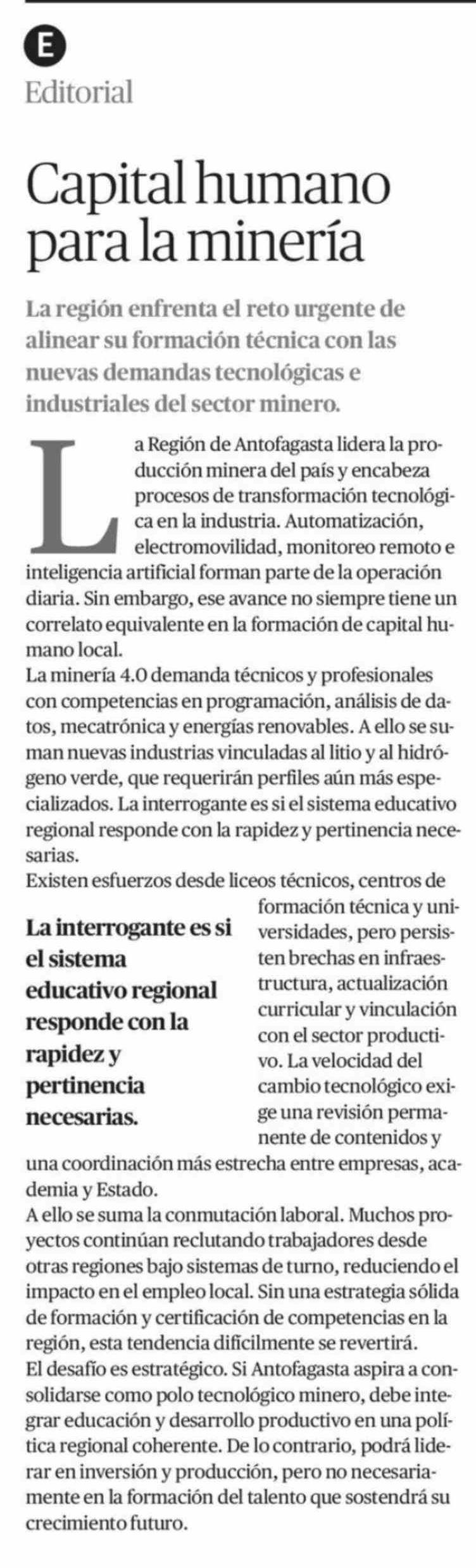 Editorial: Capital humano para la minería 20-02-2026 El Mercurio de Calama |