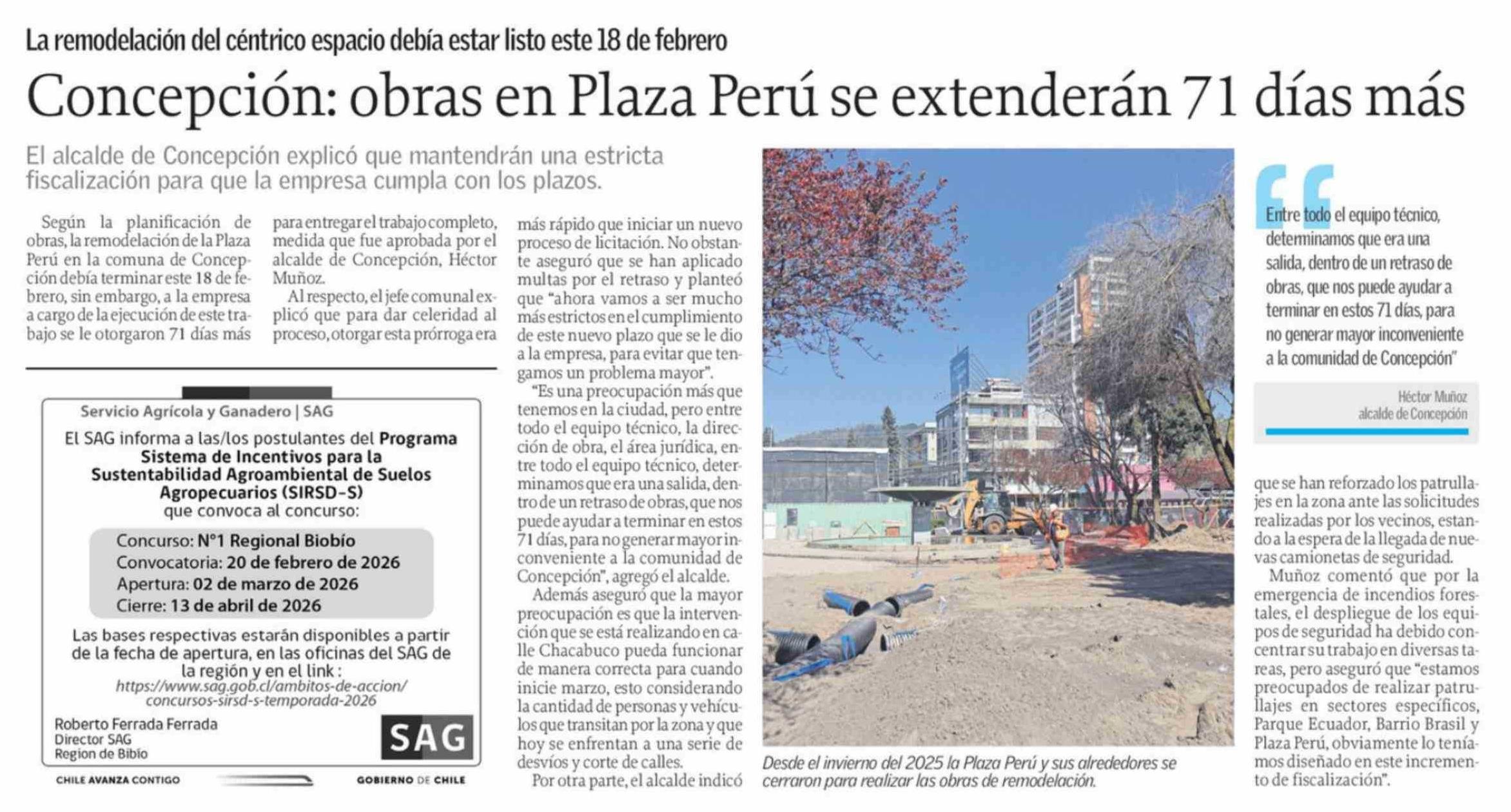 Concepción: obras en Plaza Perú se extenderán 71 días más 20-02-2026 El Sur |