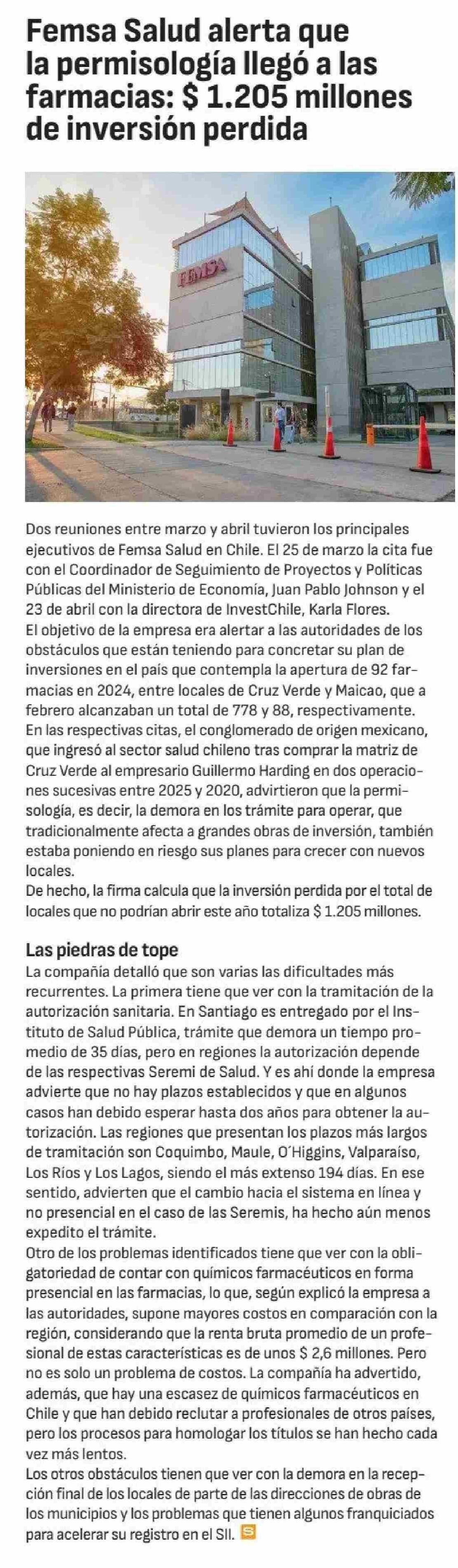 Femsa Salud alerta que la permisología llegó a las farmacias: $1.205 millones de inversión perdida 15-06-2024 Diario Financiero |
