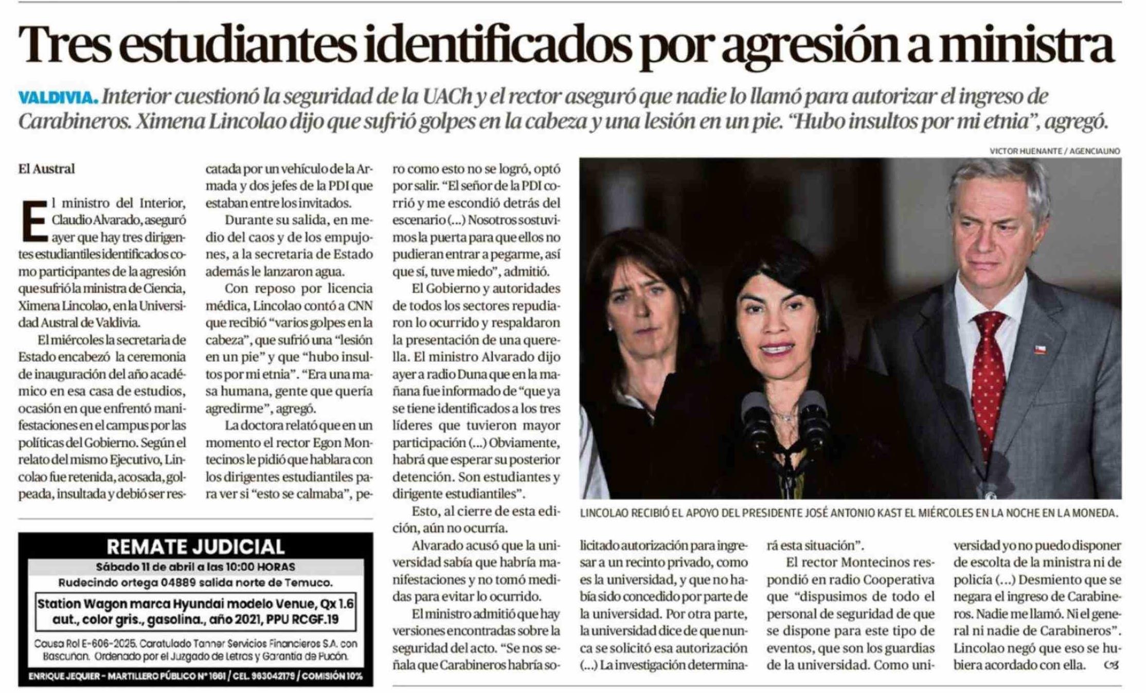 Tres estudiantes identificados por agresión a ministra 10-04-2026 El Austral de la Araucanía |