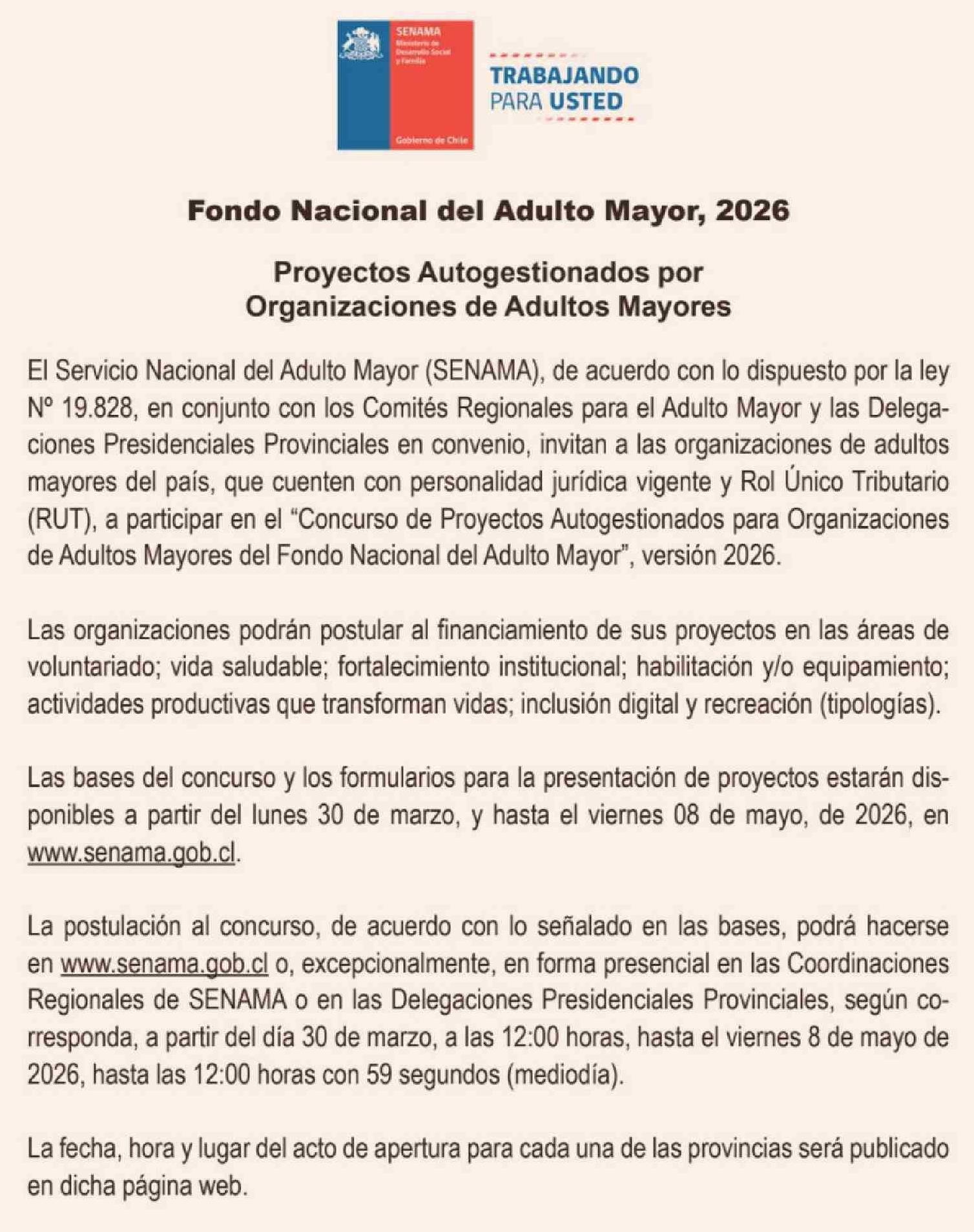 | Título: | Aviso Licitaciones: Fondo Nacional del Adulto Mayor, 2026 Proyectos Autogestionados por Organizaciones de Adultos Mayores |