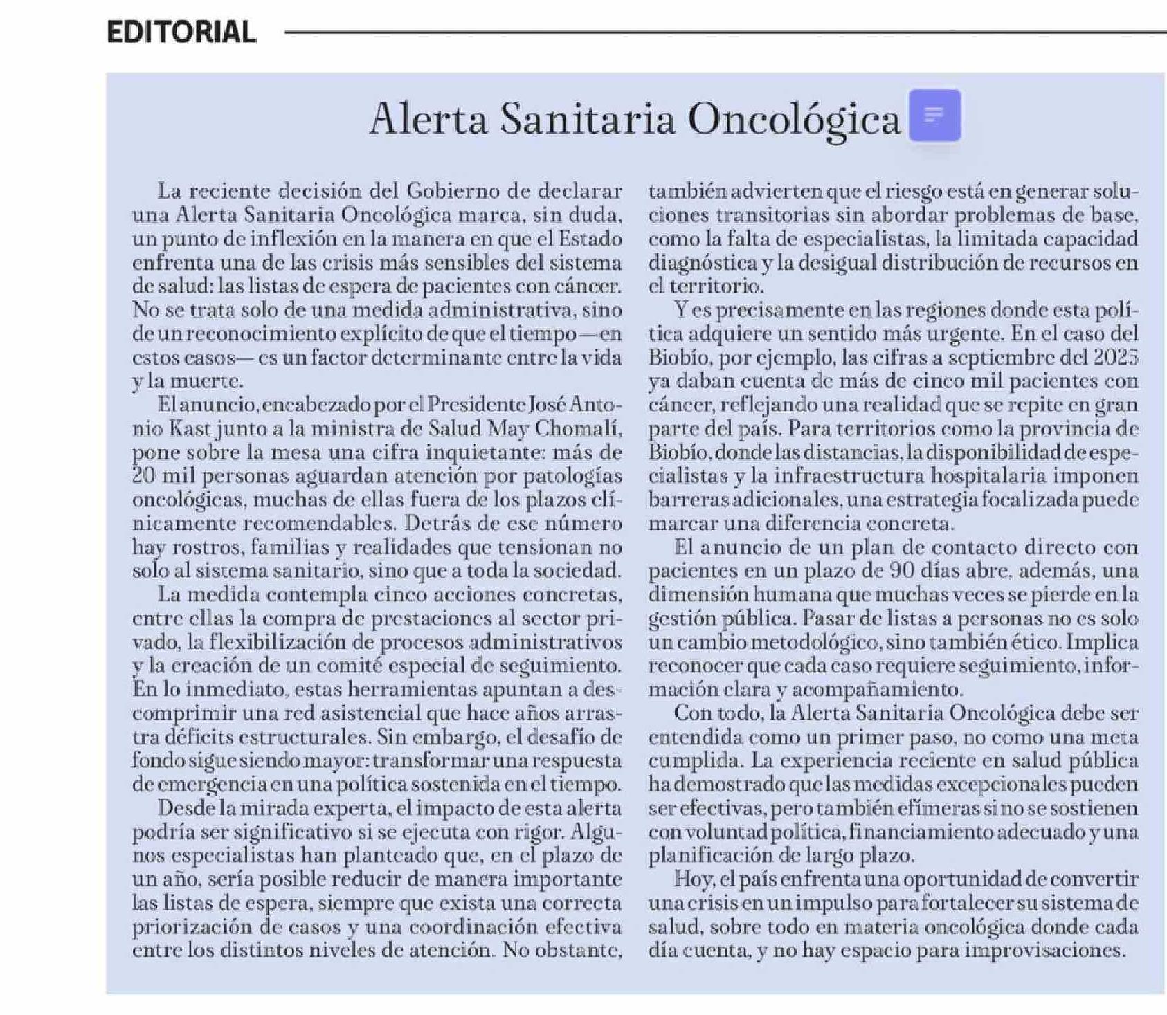 EDITORIAL: Alerta Sanitaria Oncológica 24-03-2026 La Tribuna |