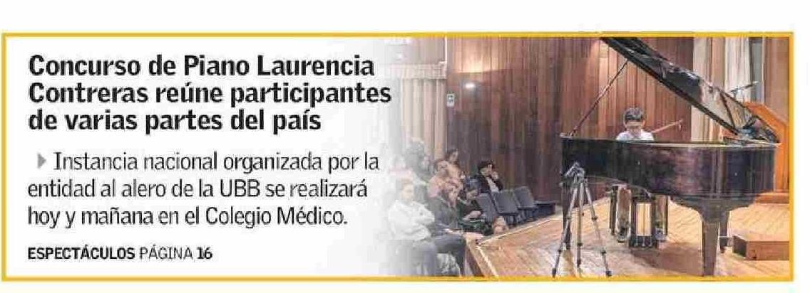 Concurso de Piano Laurencia Contreras reúne participantes de varias partes del país Instancia nacional organizada por la entidad al alero de la UBB se realizará hoy y mañana en el Colegio Médico. ESPECTÁCULOS PÁGINA 16
