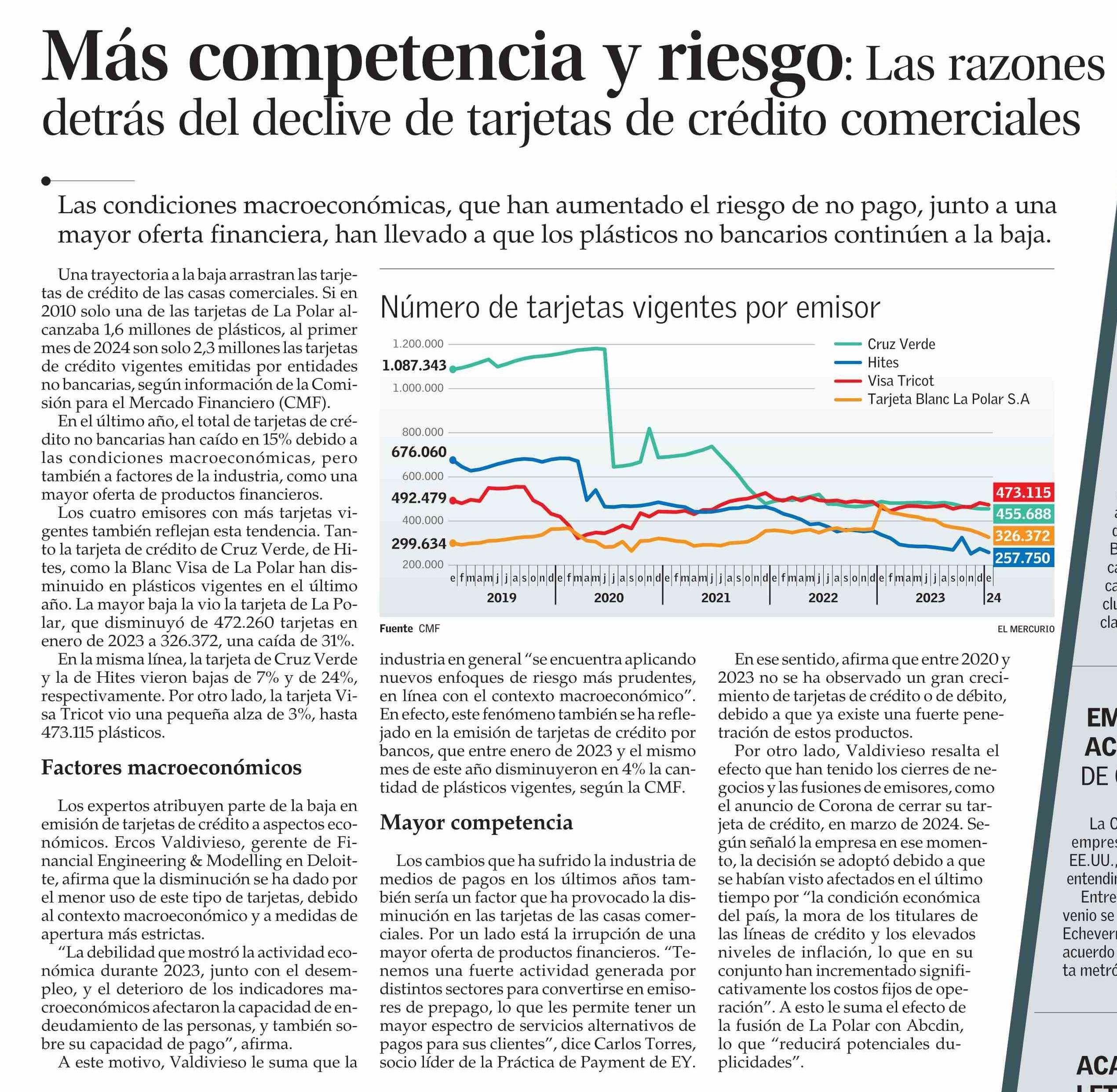Más competencia y riesgo: Las razones detrás del declive de tarjetas de crédito comerciales 30-04-2024 El Mercurio |