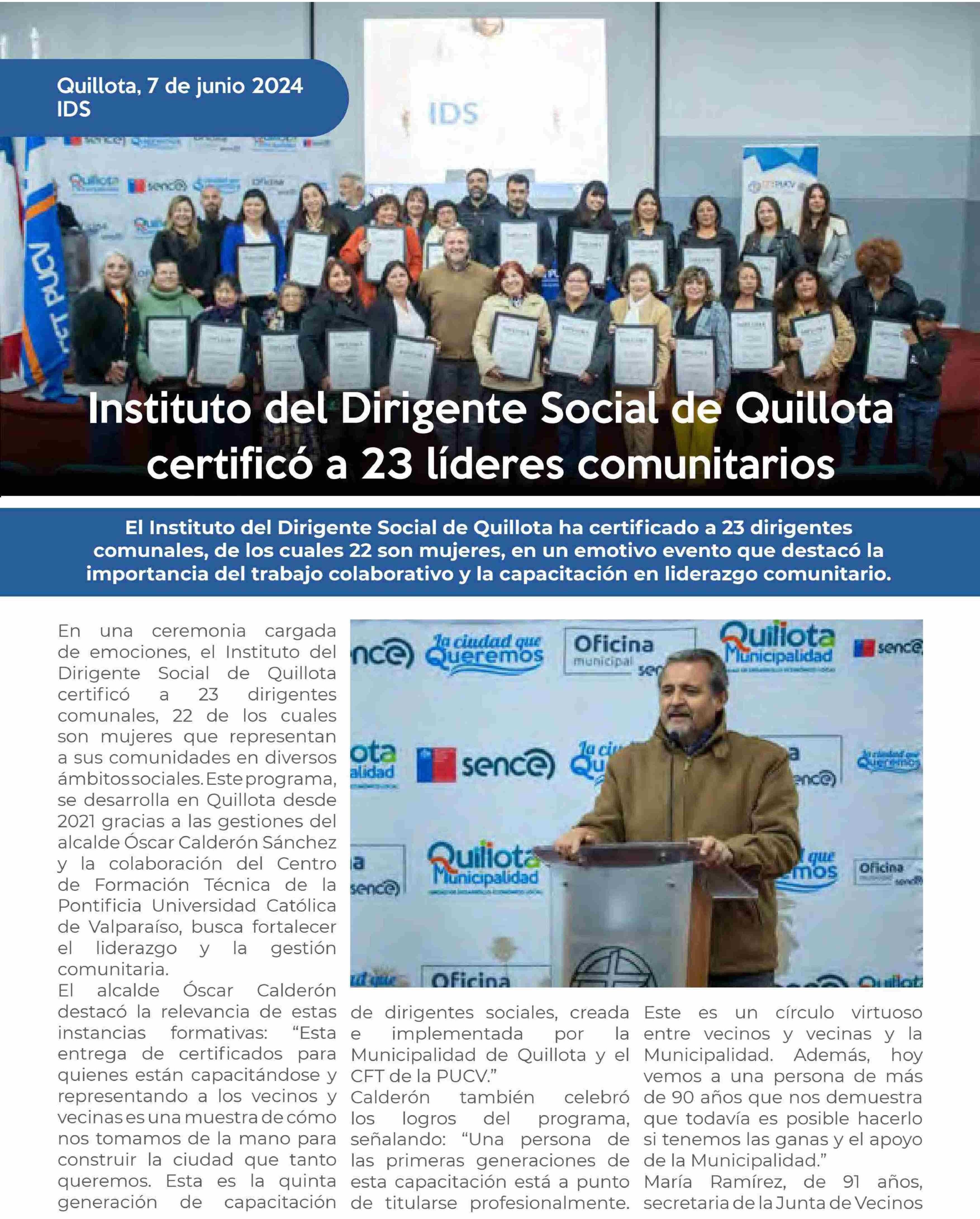 "Istituto del Dirigente Social de Quillota certificó a 23 lideres comunitarios 01-07-2024 El Observador |