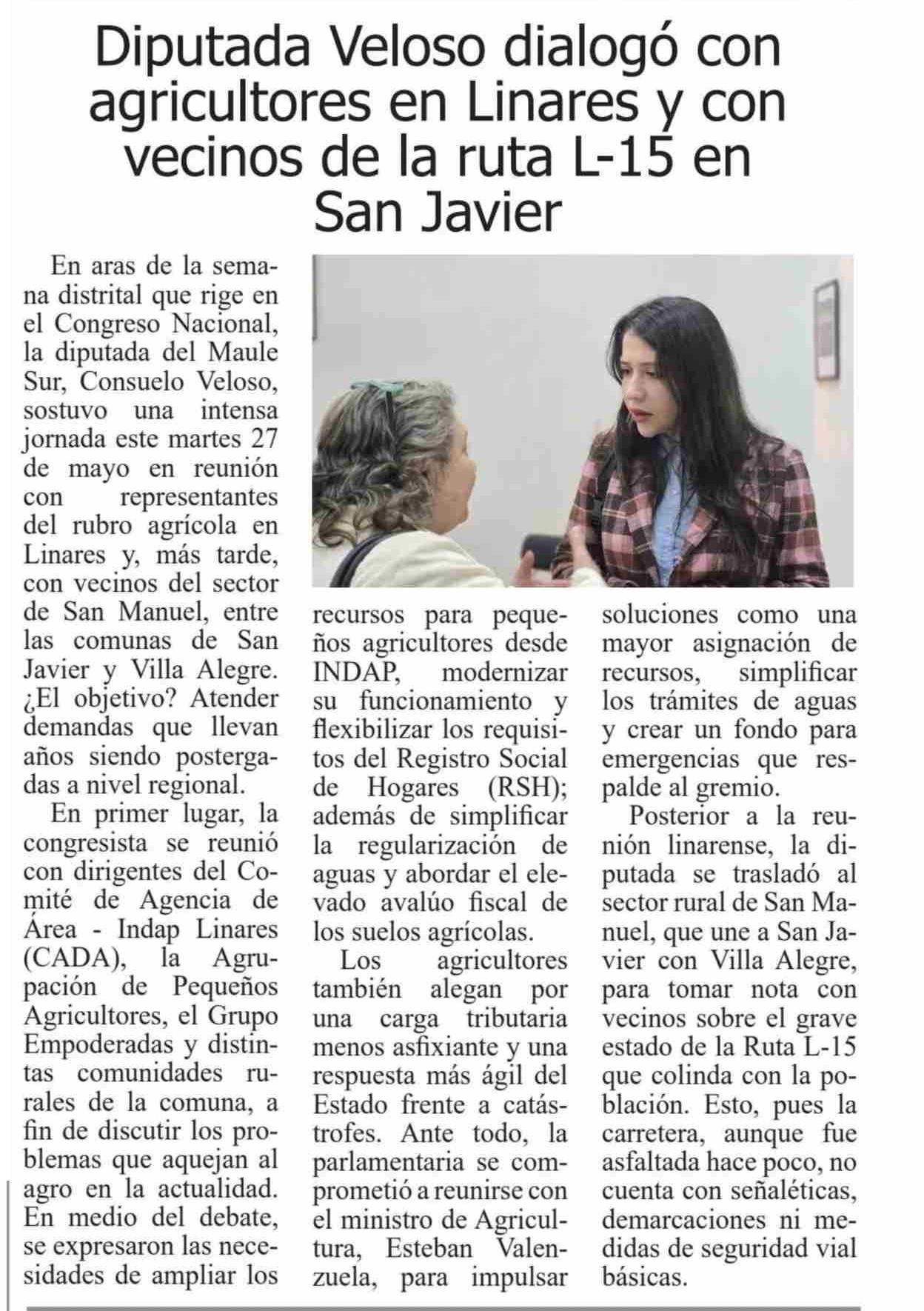 Título: Diputada Veloso dialogó con agricultores en Linares y con vecinos de la ruta L-15 en San Javier