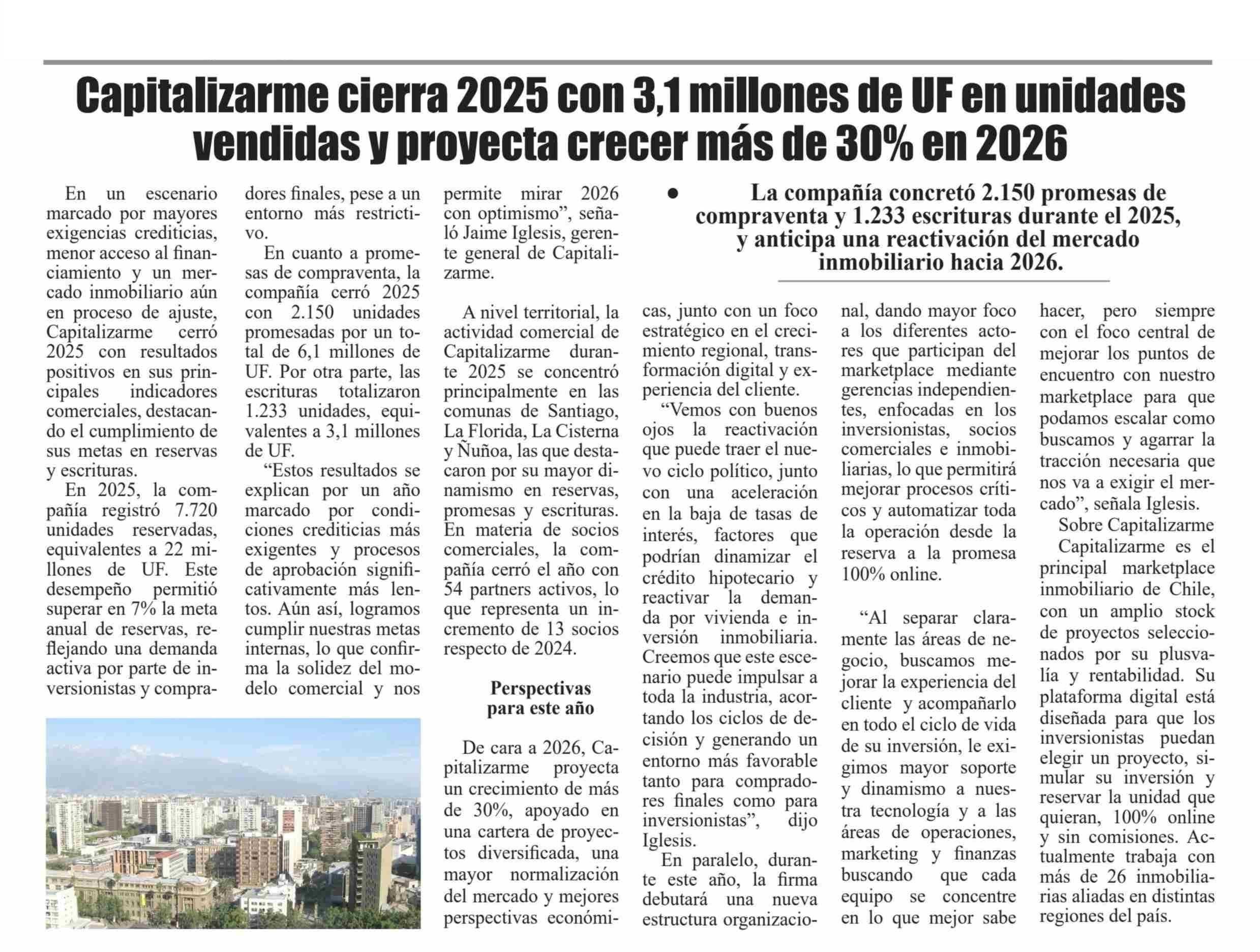 | Título: | Capitalizarme cierra 2025 con 3,1 millones de UF en unidades vendidas y proyecta crecer más de 30% en 2026 |