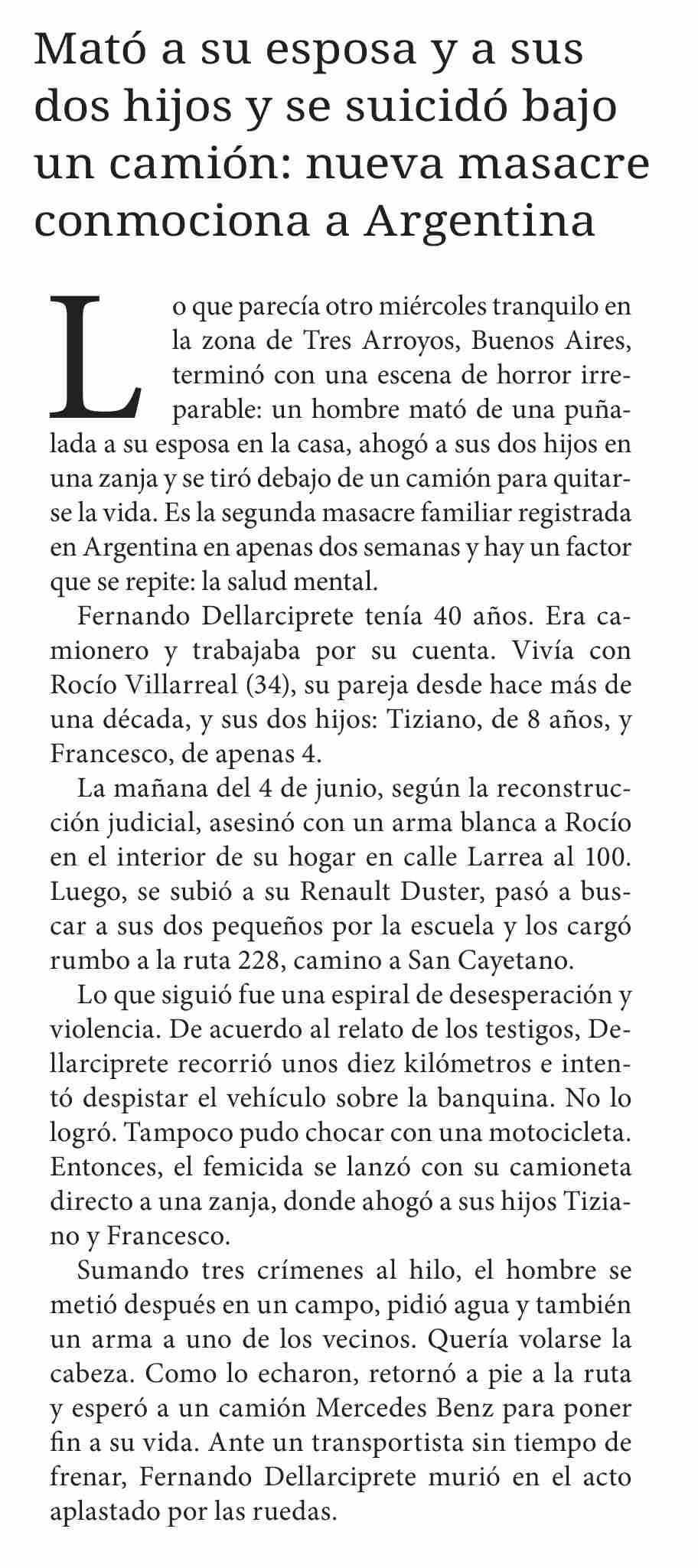 | Título: | Mató a su esposa y a sus dos hijos y se suicidó bajo un camión: nueva masacre conmociona a Argentina |