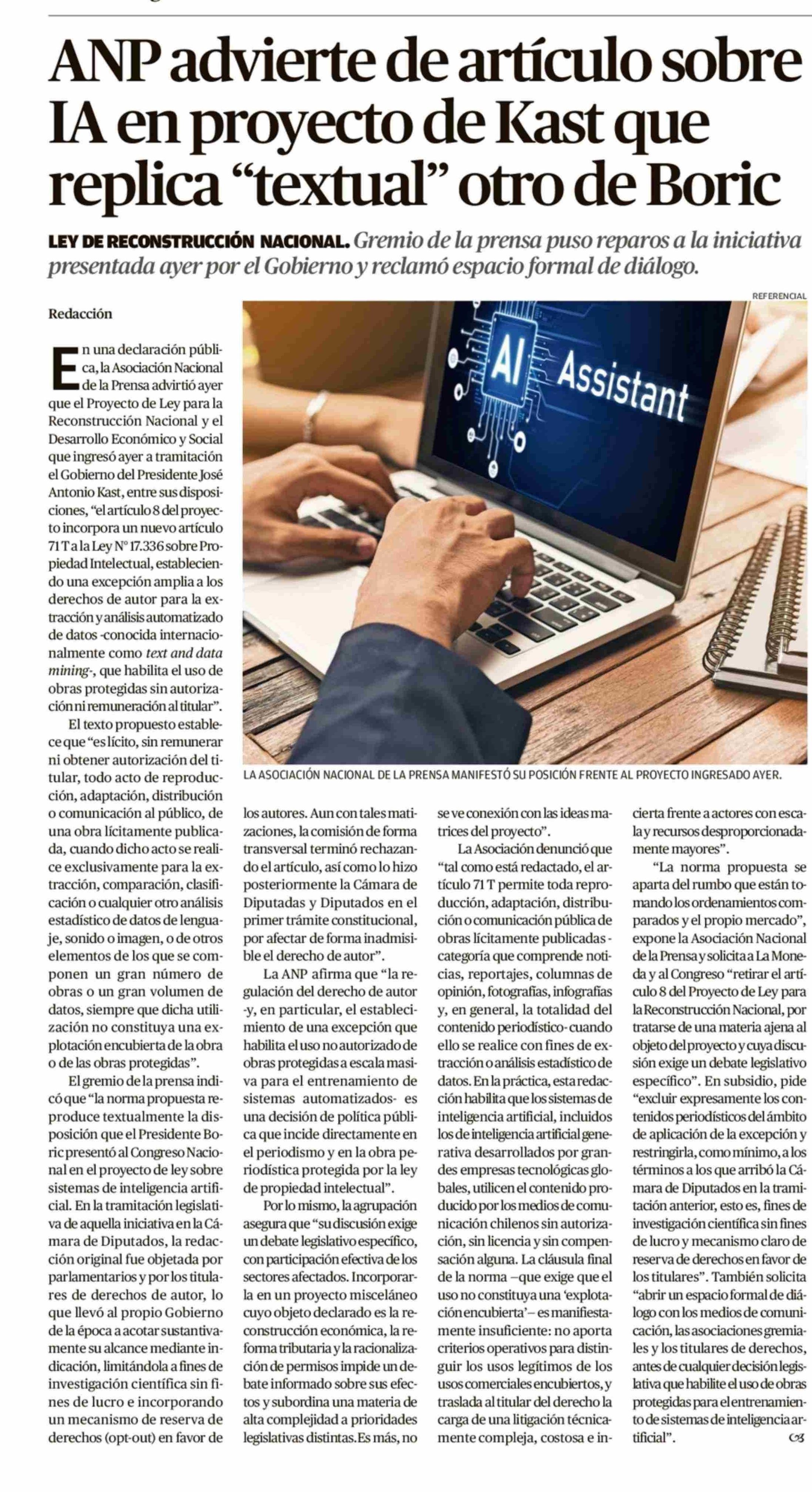 | Título: | ANP advierte de artículo sobre IA en proyecto de Kast que replica “textual” otro de Boric |