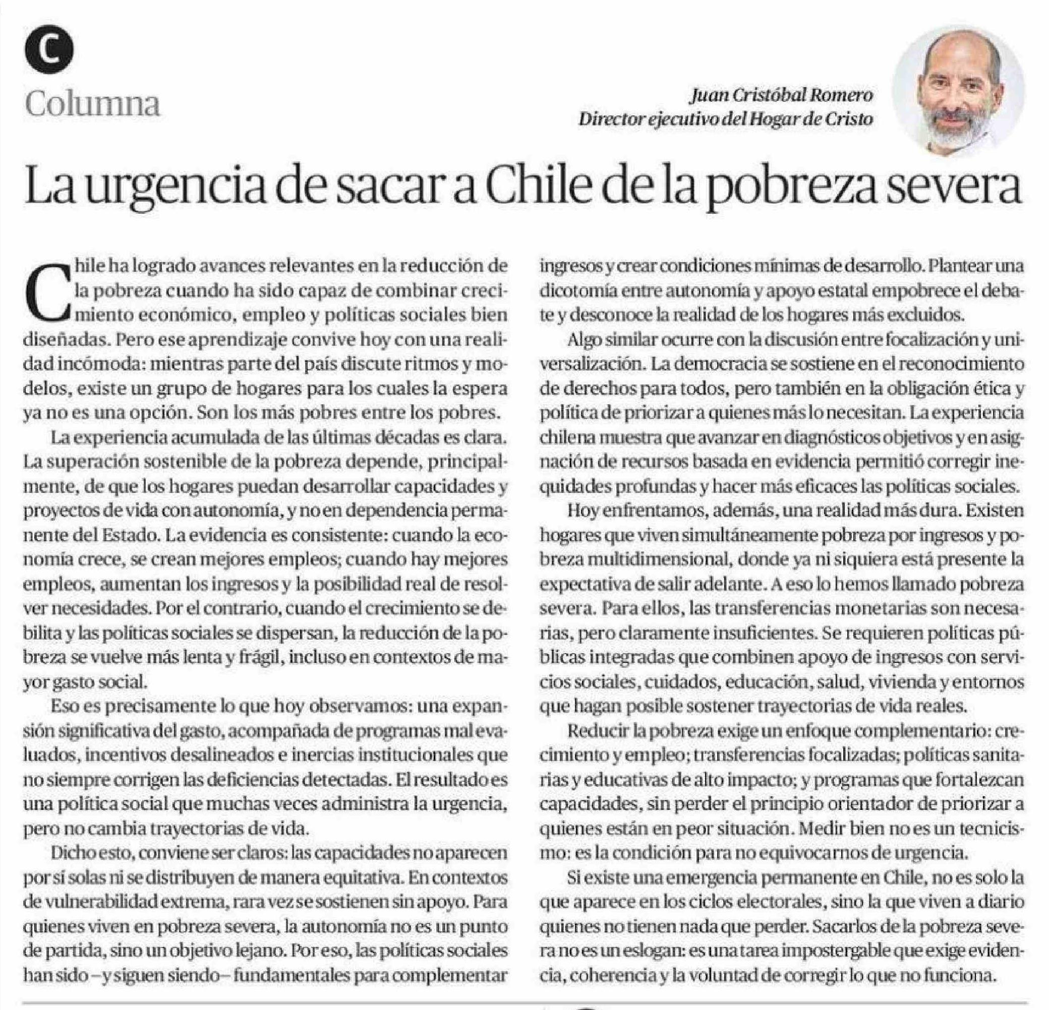 Columnas de Opinión: La urgencia de sacar a Chile de la pobreza severa 09-01-2026 El Mercurio de Antofagasta |